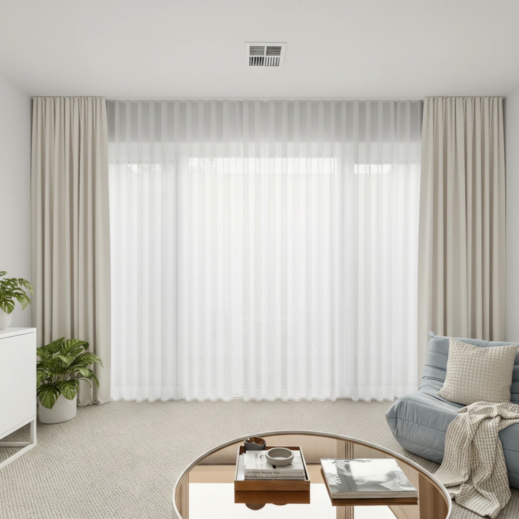 This is a double curtain system made with two layers installed on individual tracks. One layer features the Aston White sheer curtain, designed to gently filter daylight, soften the space and provide comfortable daytime privacy. The other layer is the Epic Alabaster blockout curtain, which delivers night-time privacy, darkness and added insulation. Together, the two layers give you flexible light control and a beautifully layered finish that suits modern Australian homes.