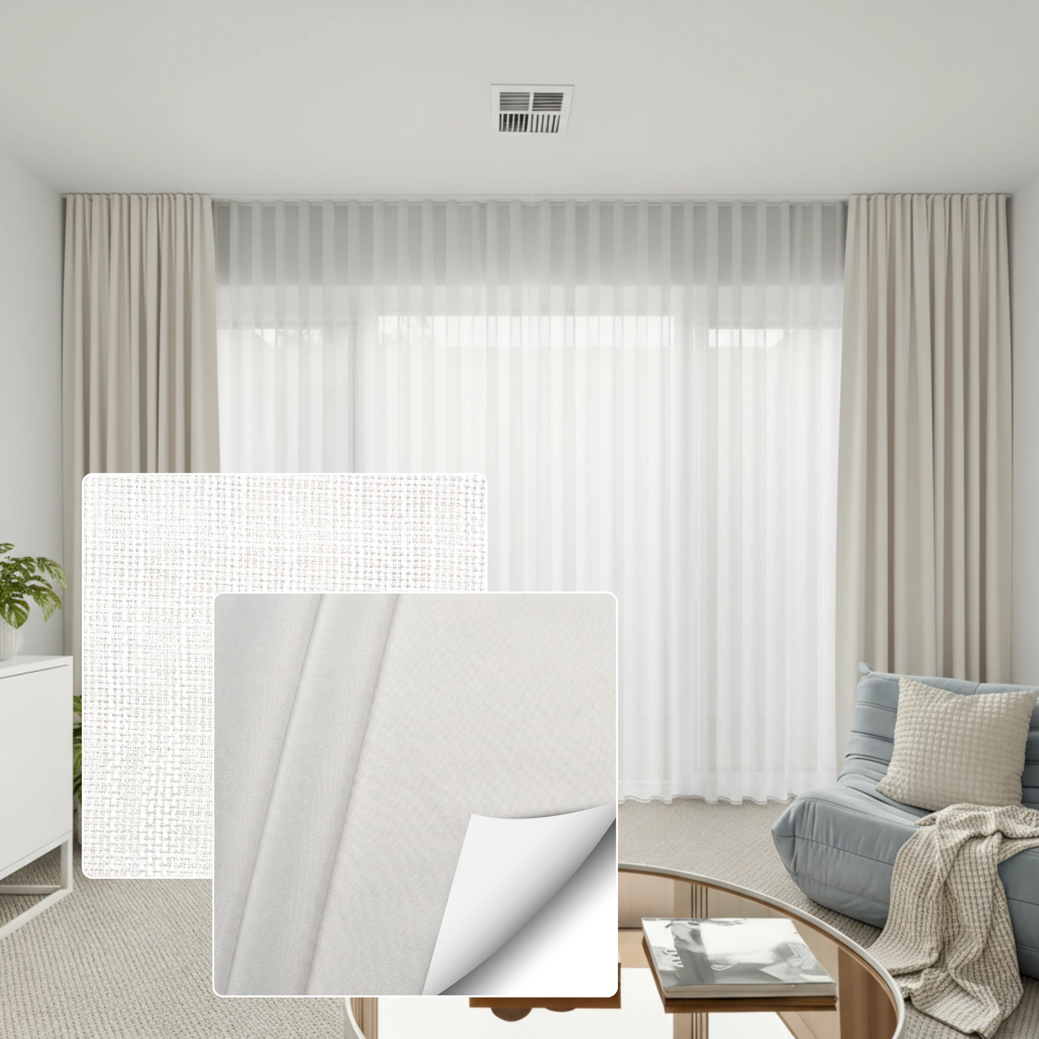 This double curtain combines two fabric types. The Aston White is a sheer curtain fabric selected for softness texture and light diffusion. The Epic Alabaster is a blockout curtain fabric designed for privacy room darkening and insulation. This combination gives you a layered look with practical performance without needing separate window furnishings.