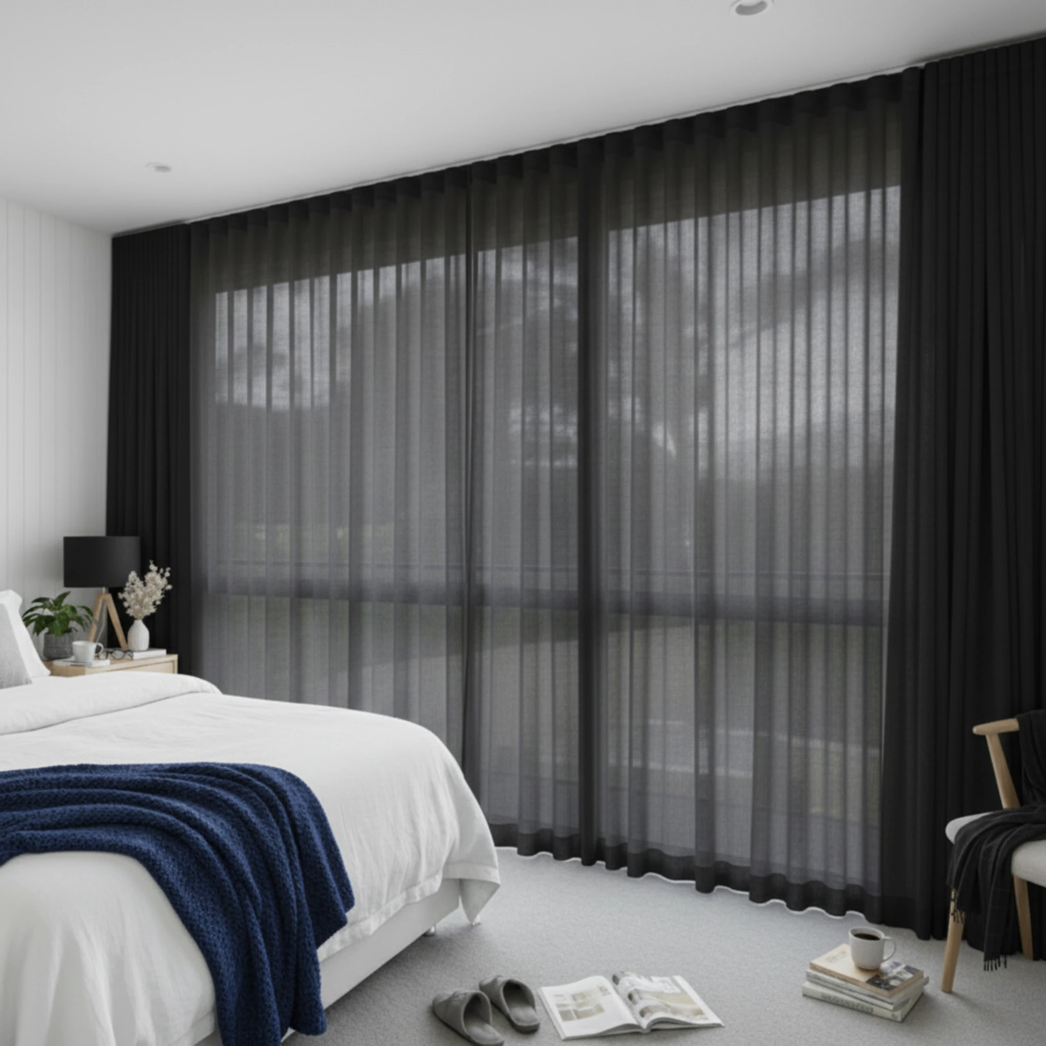 This is a double curtain system made with two layers installed on individual tracks. One layer features the Bali Black sheer curtain, designed to gently filter daylight, soften the space and provide comfortable daytime privacy. The other layer is the Galaxy Neutron blockout curtain, which delivers night-time privacy, darkness and added insulation. Together, the two layers give you flexible light control and a beautifully layered finish that suits modern Australian homes.