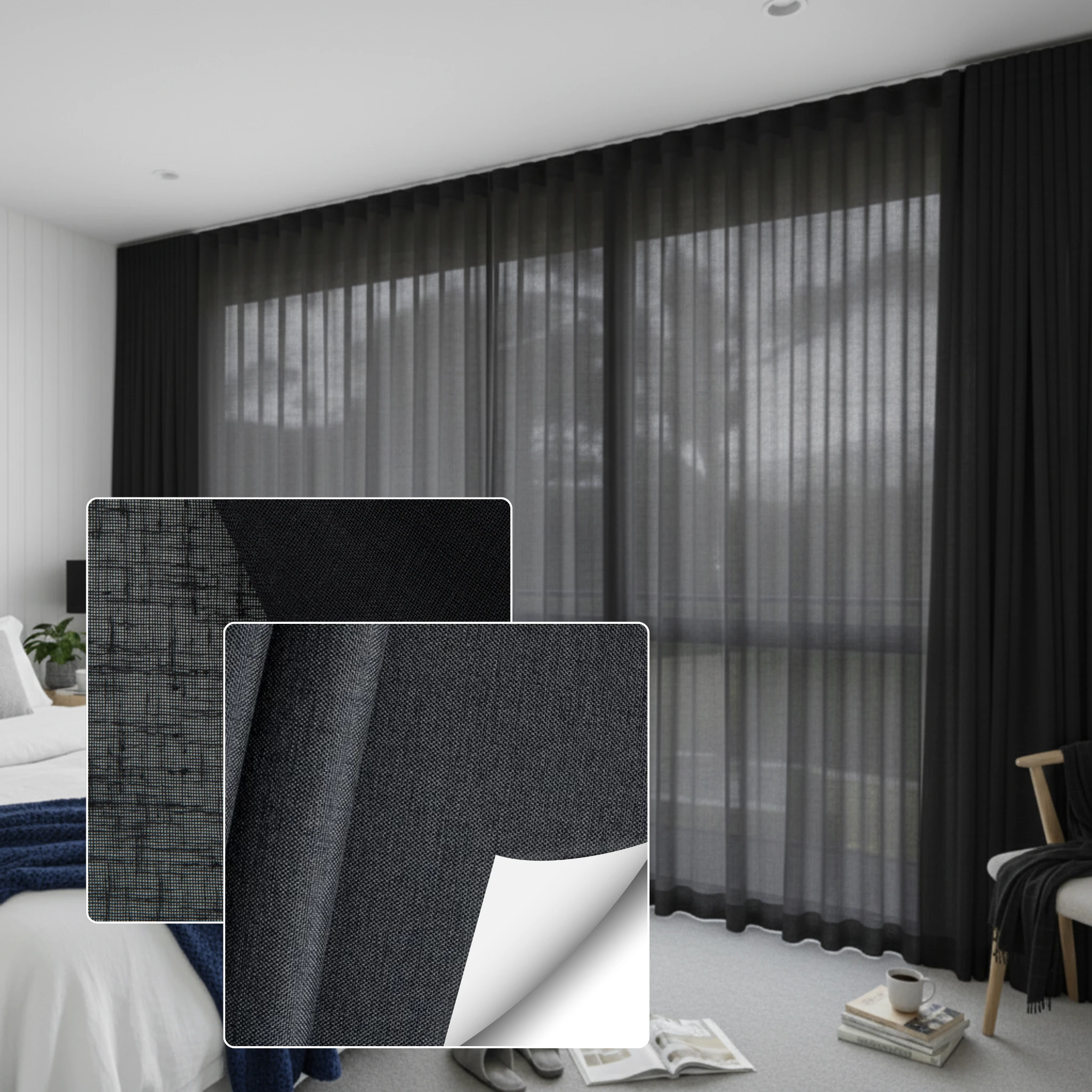 This double curtain combines two fabric types. The Bali Black is a sheer curtain fabric selected for softness texture and light diffusion. The Galaxy Neutron is a blockout curtain fabric designed for privacy room darkening and insulation. This combination gives you a layered look with practical performance without needing separate window furnishings.