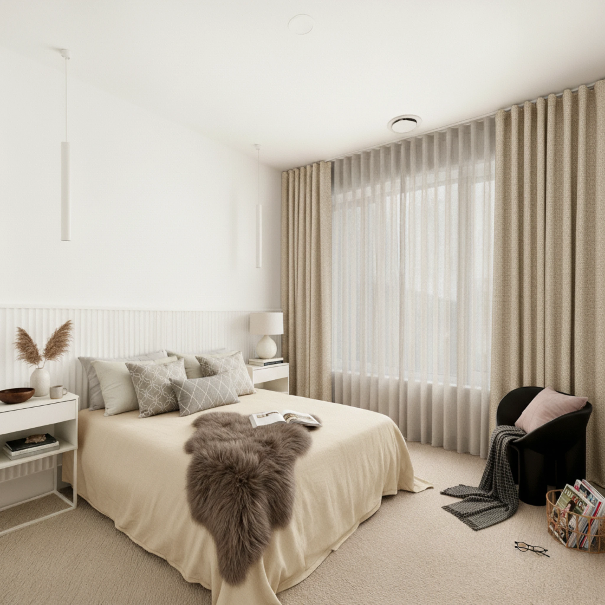 This is a double curtain system made with two layers installed on individual tracks. One layer features the Bali Blush sheer curtain, designed to gently filter daylight, soften the space and provide comfortable daytime privacy. The other layer is the Belmore Driftwood blockout curtain, which delivers night-time privacy, darkness and added insulation. Together, the two layers give you flexible light control and a beautifully layered finish that suits modern Australian homes.