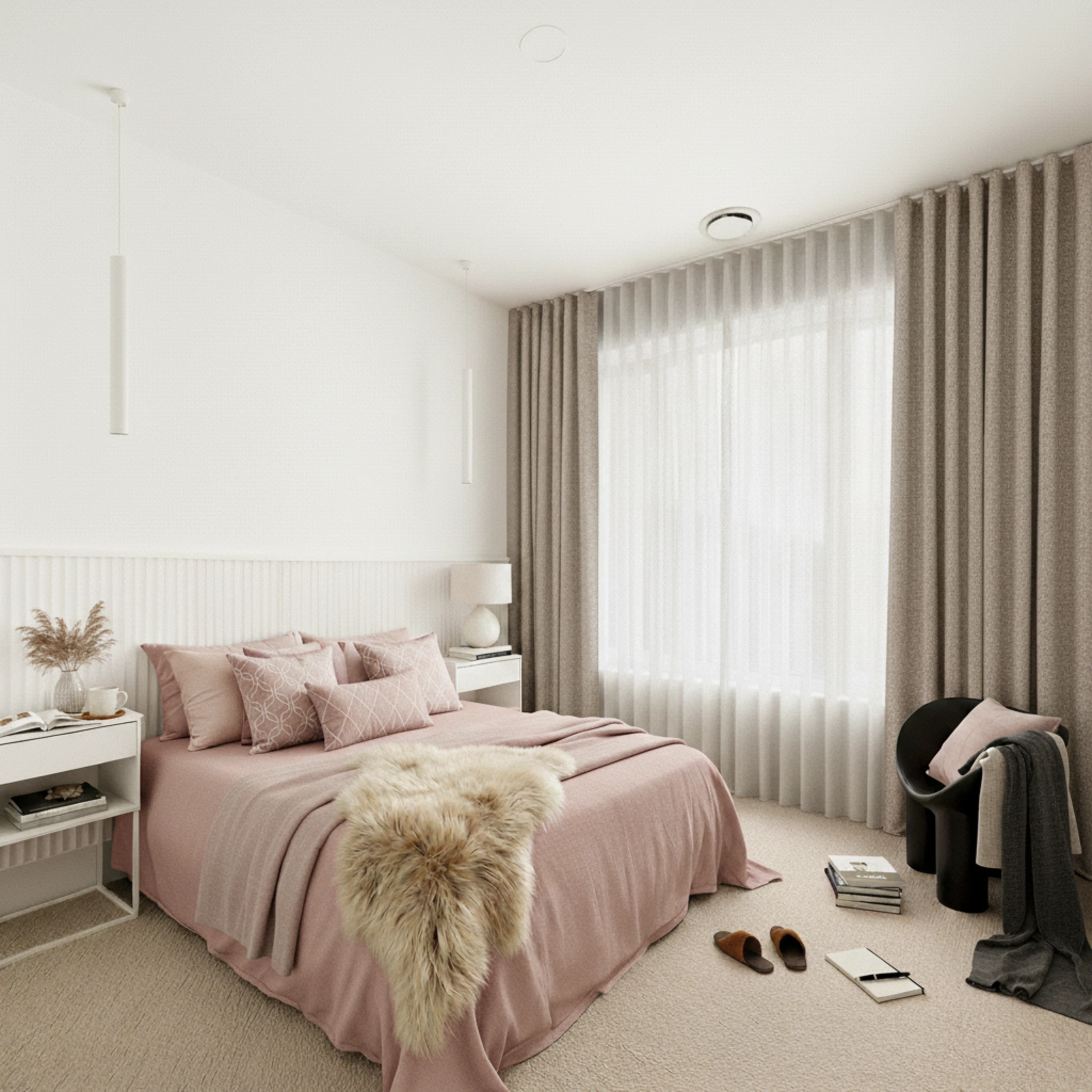 This is a double curtain system made with two layers installed on individual tracks. One layer features the Bali Blush sheer curtain, designed to gently filter daylight, soften the space and provide comfortable daytime privacy. The other layer is the Belmore Taupe blockout curtain, which delivers night-time privacy, darkness and added insulation. Together, the two layers give you flexible light control and a beautifully layered finish that suits modern Australian homes.
