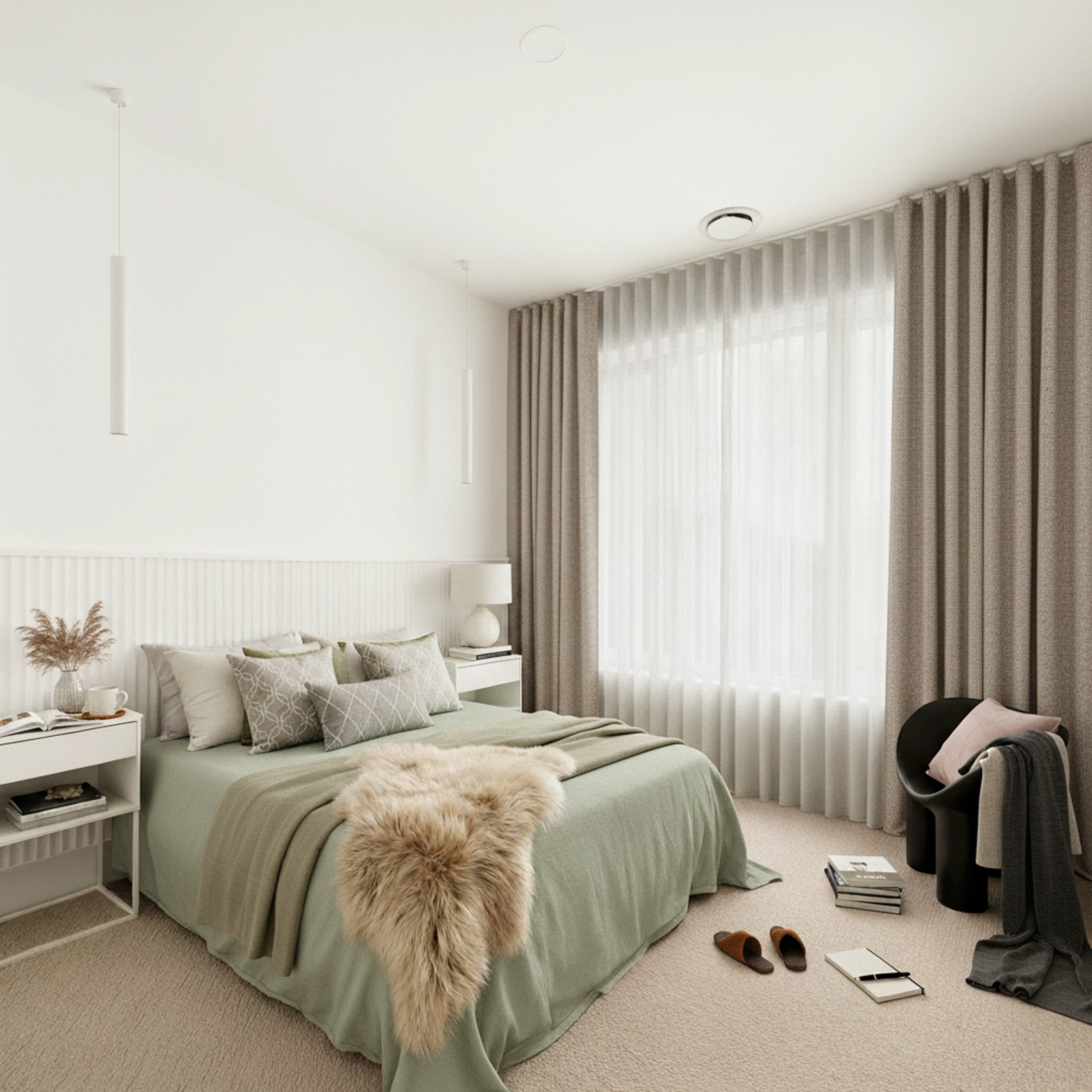This is a double curtain system made with two layers installed on individual tracks. One layer features the Bali Chalk sheer curtain, designed to gently filter daylight, soften the space and provide comfortable daytime privacy. The other layer is the Belmore Taupe blockout curtain, which delivers night-time privacy, darkness and added insulation. Together, the two layers give you flexible light control and a beautifully layered finish that suits modern Australian homes.