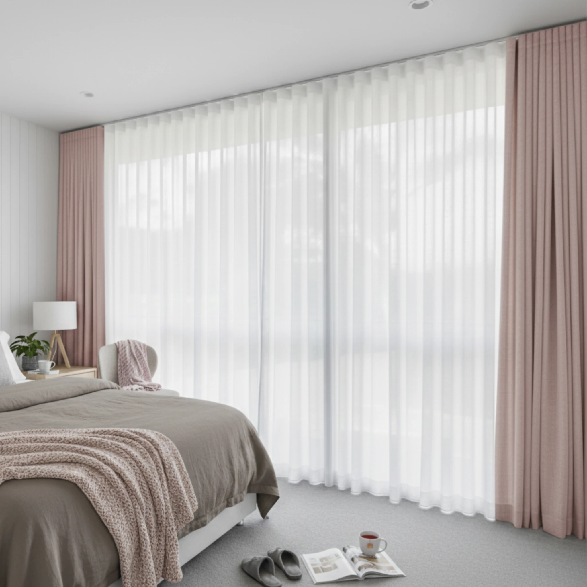 This is a double curtain system made with two layers installed on individual tracks. One layer features the Bali Chalk sheer curtain, designed to gently filter daylight, soften the space and provide comfortable daytime privacy. The other layer is the Galaxy Dusk blockout curtain, which delivers night-time privacy, darkness and added insulation. Together, the two layers give you flexible light control and a beautifully layered finish that suits modern Australian homes.
