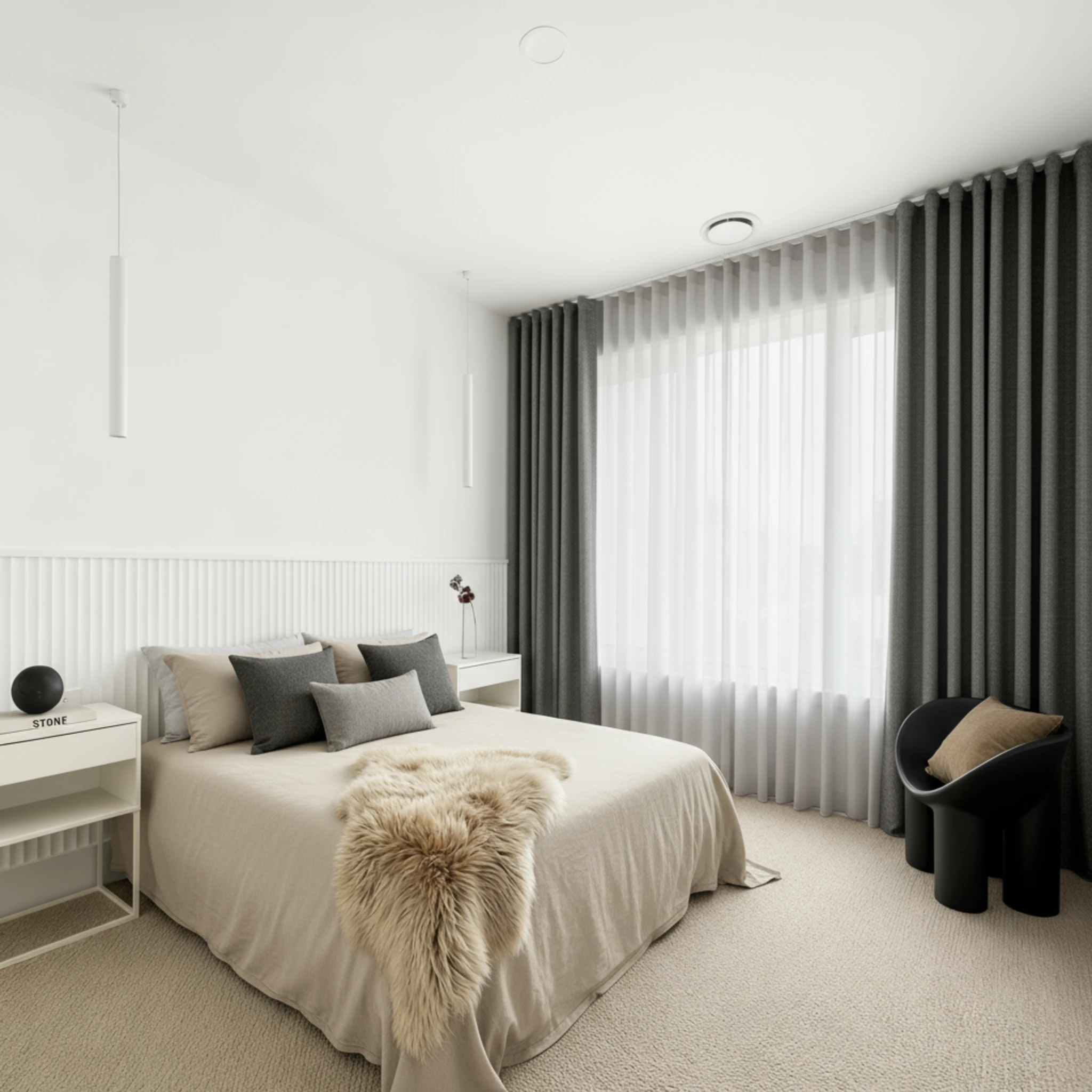 This is a double curtain system made with two layers installed on individual tracks. One layer features the Bali Cloud sheer curtain, designed to gently filter daylight, soften the space and provide comfortable daytime privacy. The other layer is the Belmore Jasper blockout curtain, which delivers night-time privacy, darkness and added insulation. Together, the two layers give you flexible light control and a beautifully layered finish that suits modern Australian homes.