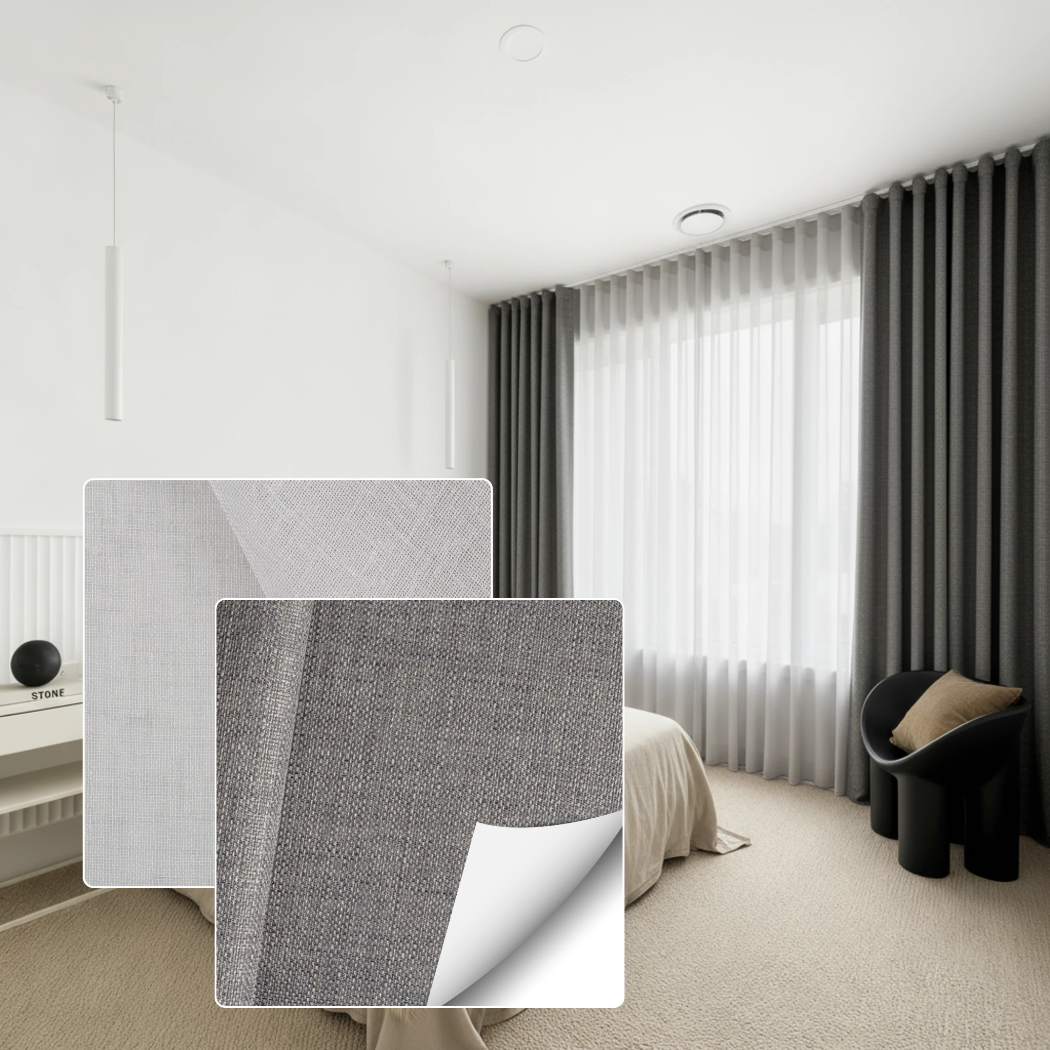 This double curtain combines two fabric types. The Bali Cloud is a sheer curtain fabric selected for softness texture and light diffusion. The Belmore Jasper is a blockout curtain fabric designed for privacy room darkening and insulation. This combination gives you a layered look with practical performance without needing separate window furnishings.