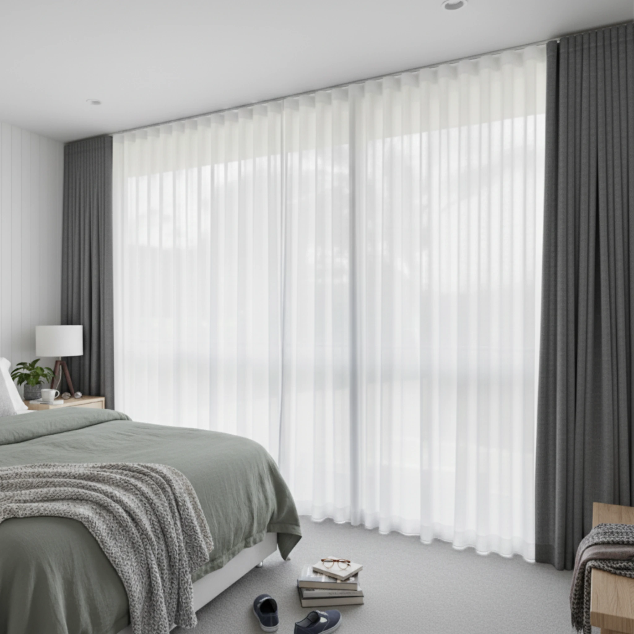 This is a double curtain system made with two layers installed on individual tracks. One layer features the Bali Cloud sheer curtain, designed to gently filter daylight, soften the space and provide comfortable daytime privacy. The other layer is the Galaxy Saturn blockout curtain, which delivers night-time privacy, darkness and added insulation. Together, the two layers give you flexible light control and a beautifully layered finish that suits modern Australian homes.