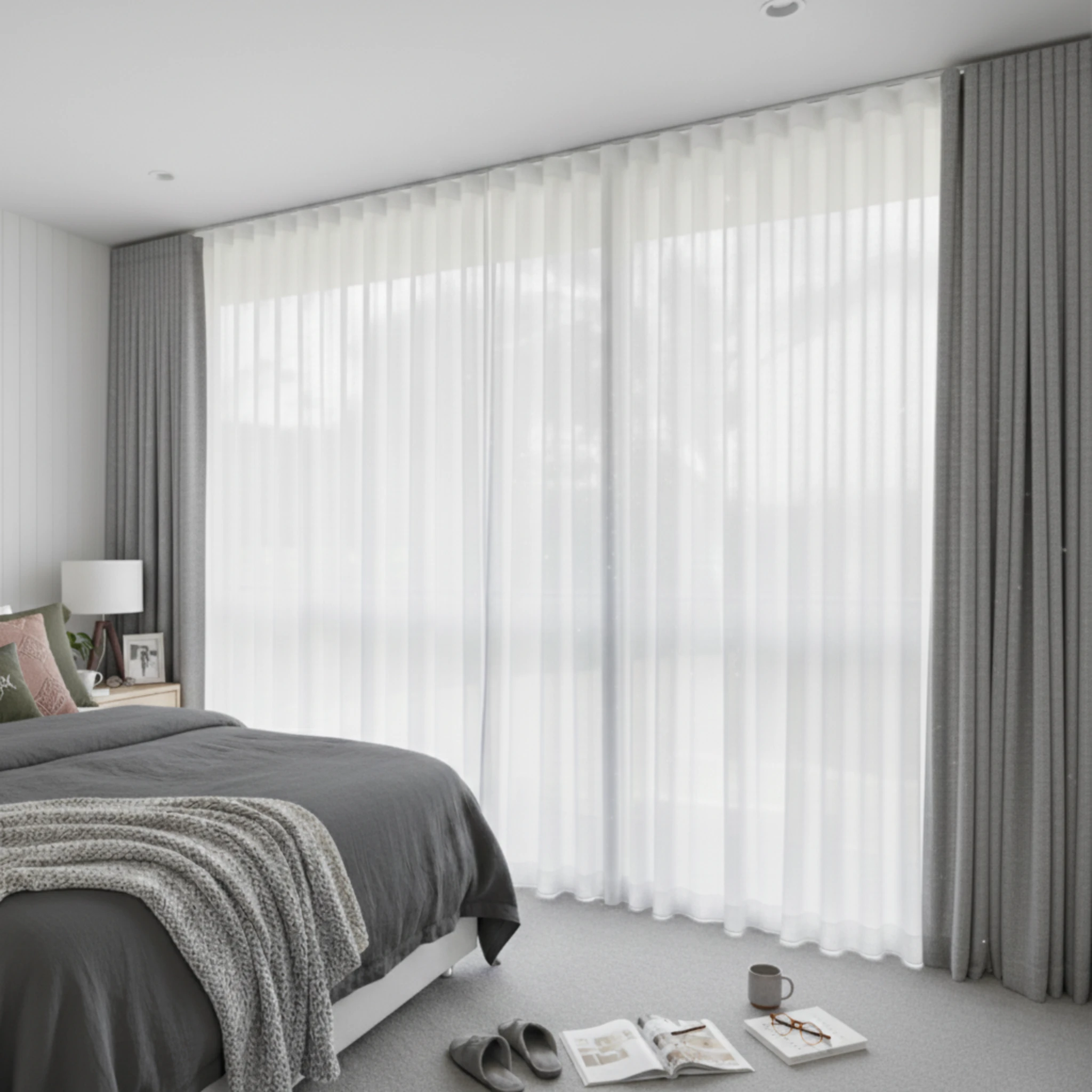 This is a double curtain system made with two layers installed on individual tracks. One layer features the Bali Cloud sheer curtain, designed to gently filter daylight, soften the space and provide comfortable daytime privacy. The other layer is the Galaxy Twilight blockout curtain, which delivers night-time privacy, darkness and added insulation. Together, the two layers give you flexible light control and a beautifully layered finish that suits modern Australian homes.