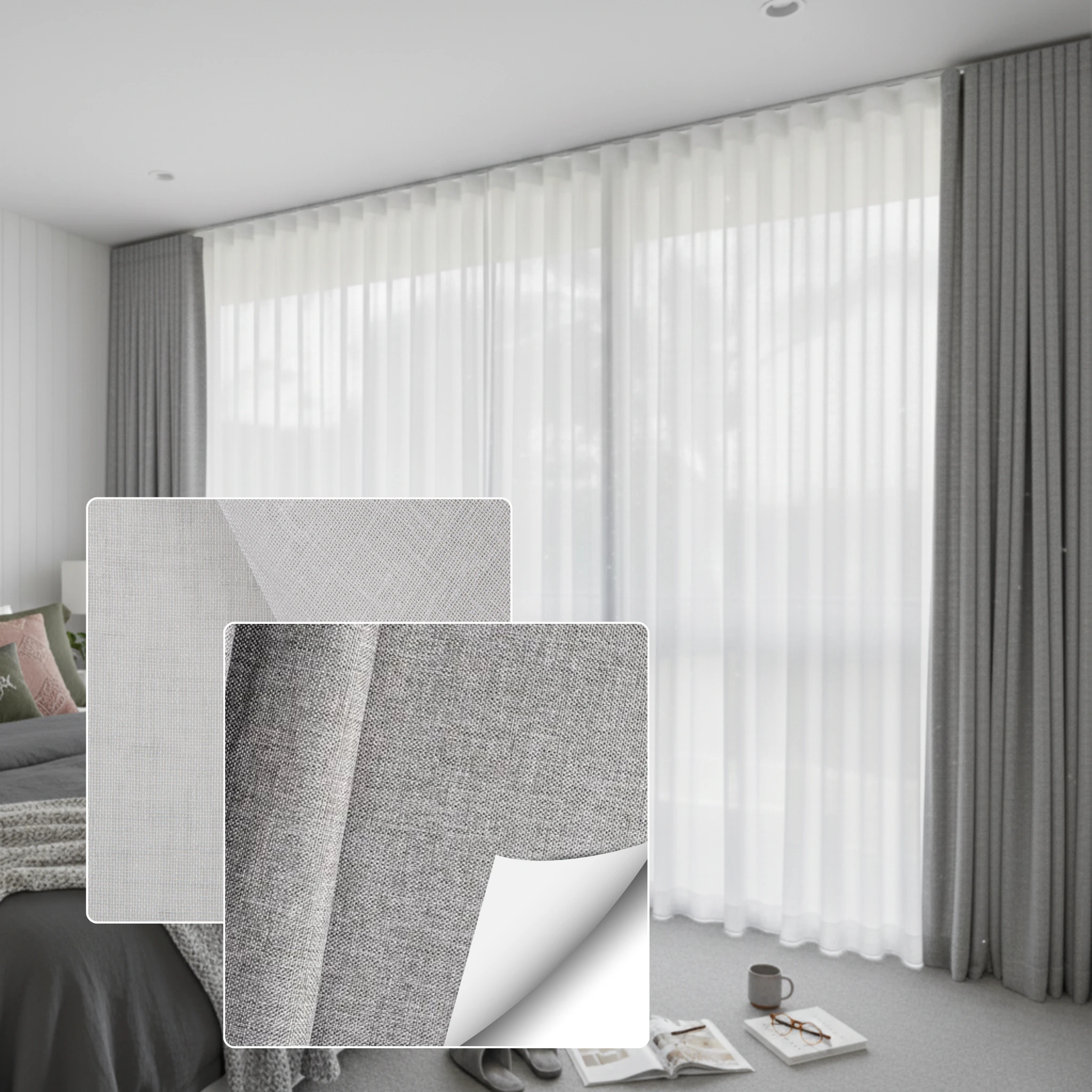 This double curtain combines two fabric types. The Bali Cloud is a sheer curtain fabric selected for softness texture and light diffusion. The Galaxy Twilight is a blockout curtain fabric designed for privacy room darkening and insulation. This combination gives you a layered look with practical performance without needing separate window furnishings.