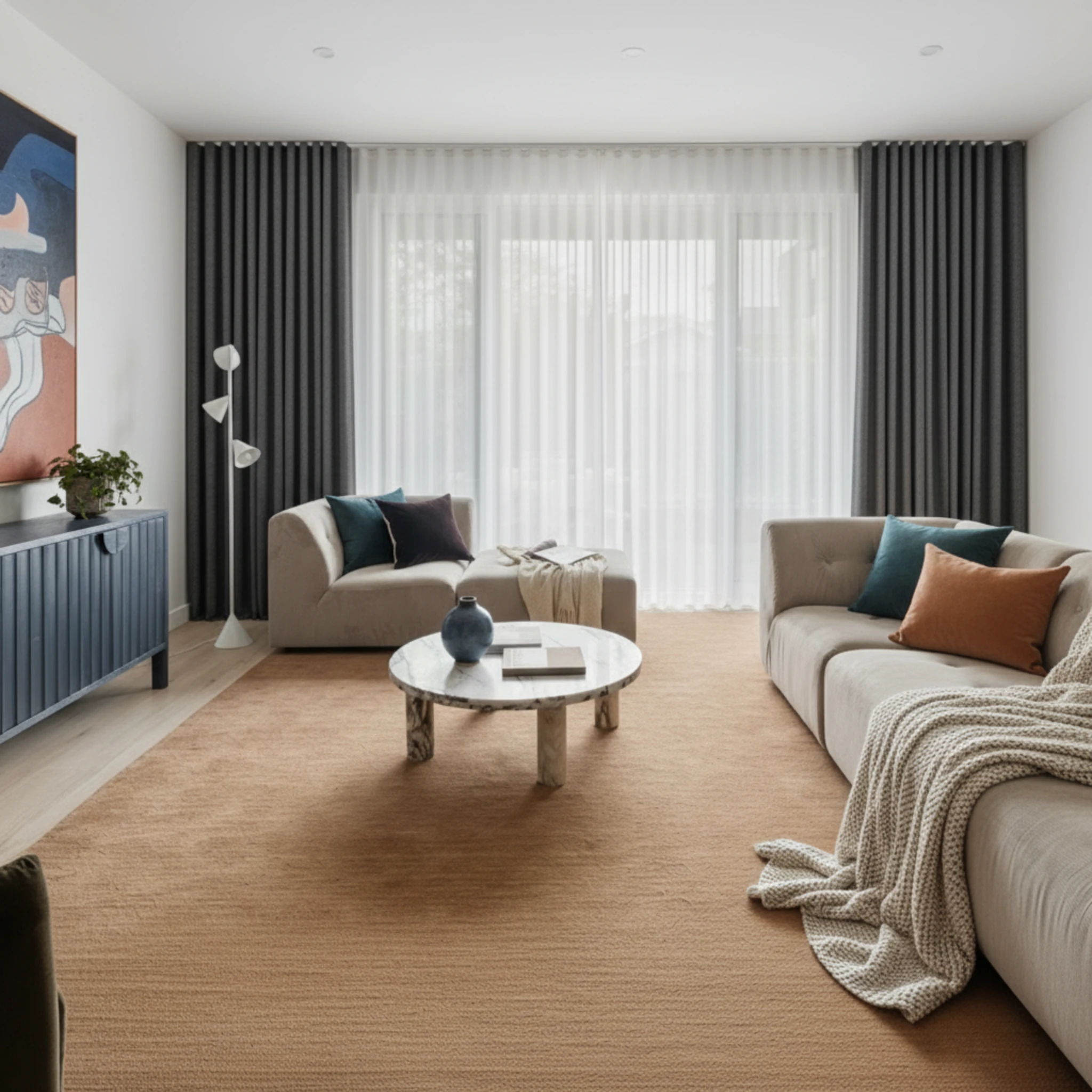 This is a double curtain system made with two layers installed on individual tracks. One layer features the Bali Cloud sheer curtain, designed to gently filter daylight, soften the space and provide comfortable daytime privacy. The other layer is the Soleil Cement blockout curtain, which delivers night-time privacy, darkness and added insulation. Together, the two layers give you flexible light control and a beautifully layered finish that suits modern Australian homes.