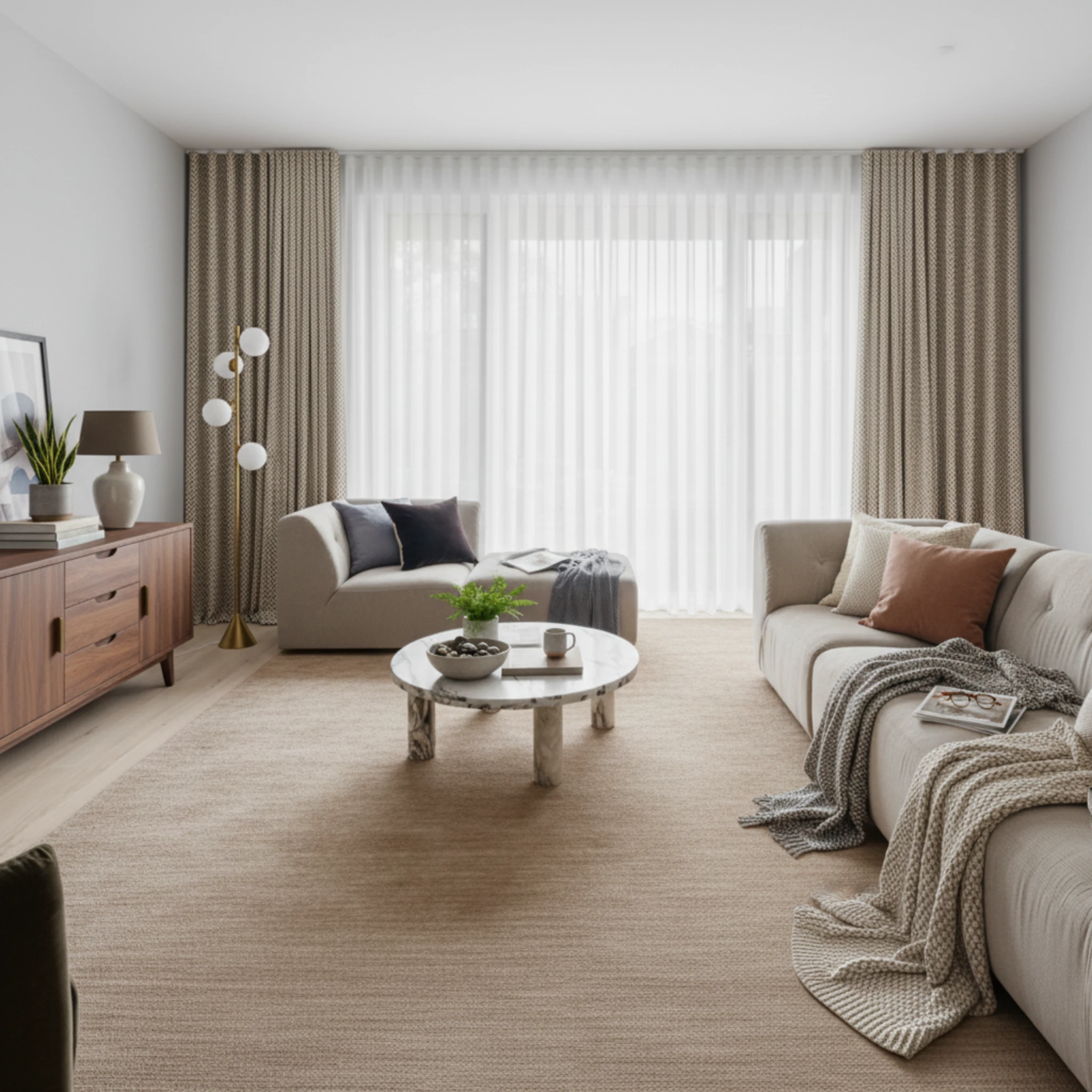 This is a double curtain system made with two layers installed on individual tracks. One layer features the Bali Driftwood sheer curtain, designed to gently filter daylight, soften the space and provide comfortable daytime privacy. The other layer is the Soleil Nugget blockout curtain, which delivers night-time privacy, darkness and added insulation. Together, the two layers give you flexible light control and a beautifully layered finish that suits modern Australian homes.