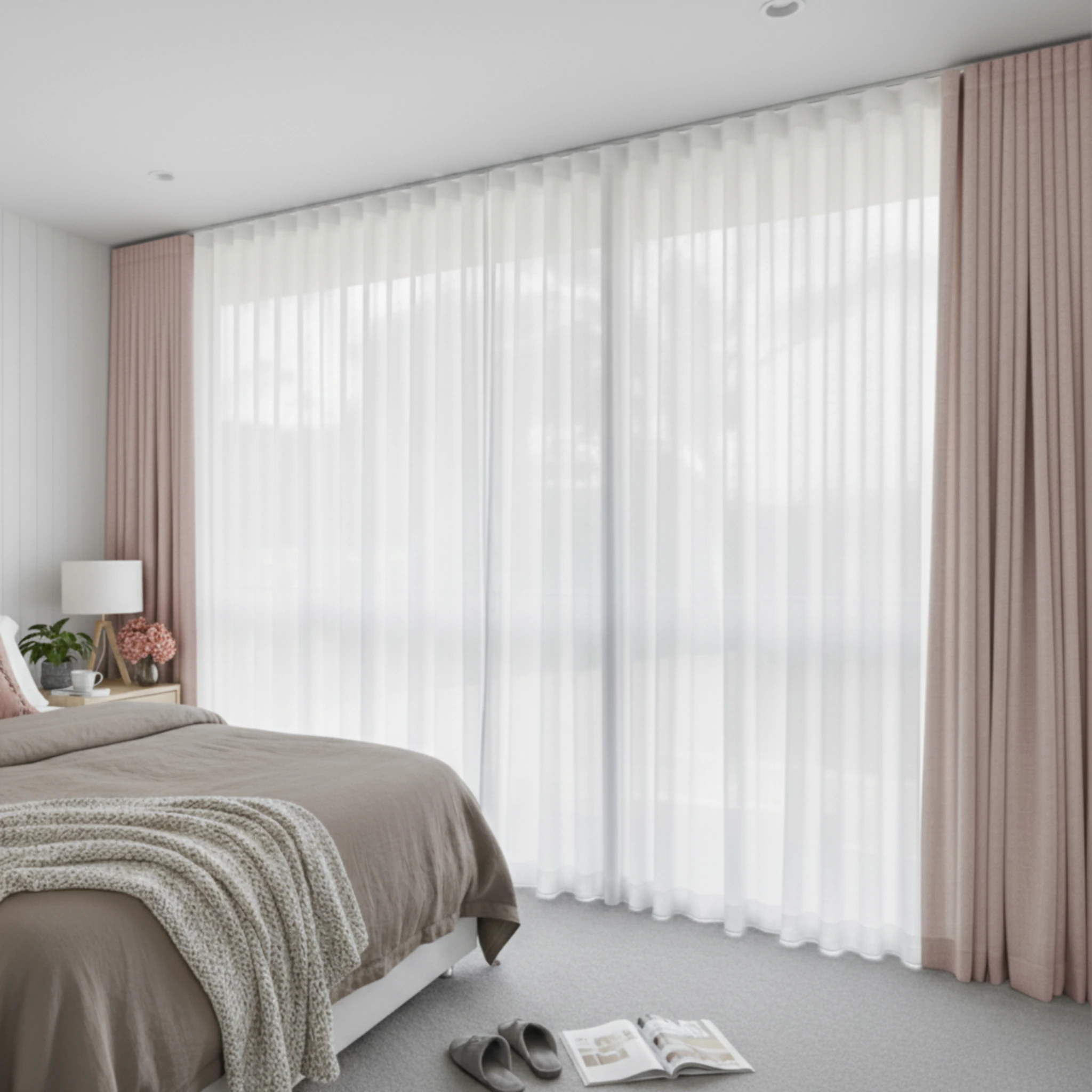 This is a double curtain system made with two layers installed on individual tracks. One layer features the Bali Pearl sheer curtain, designed to gently filter daylight, soften the space and provide comfortable daytime privacy. The other layer is the Galaxy Dusk blockout curtain, which delivers night-time privacy, darkness and added insulation. Together, the two layers give you flexible light control and a beautifully layered finish that suits modern Australian homes.