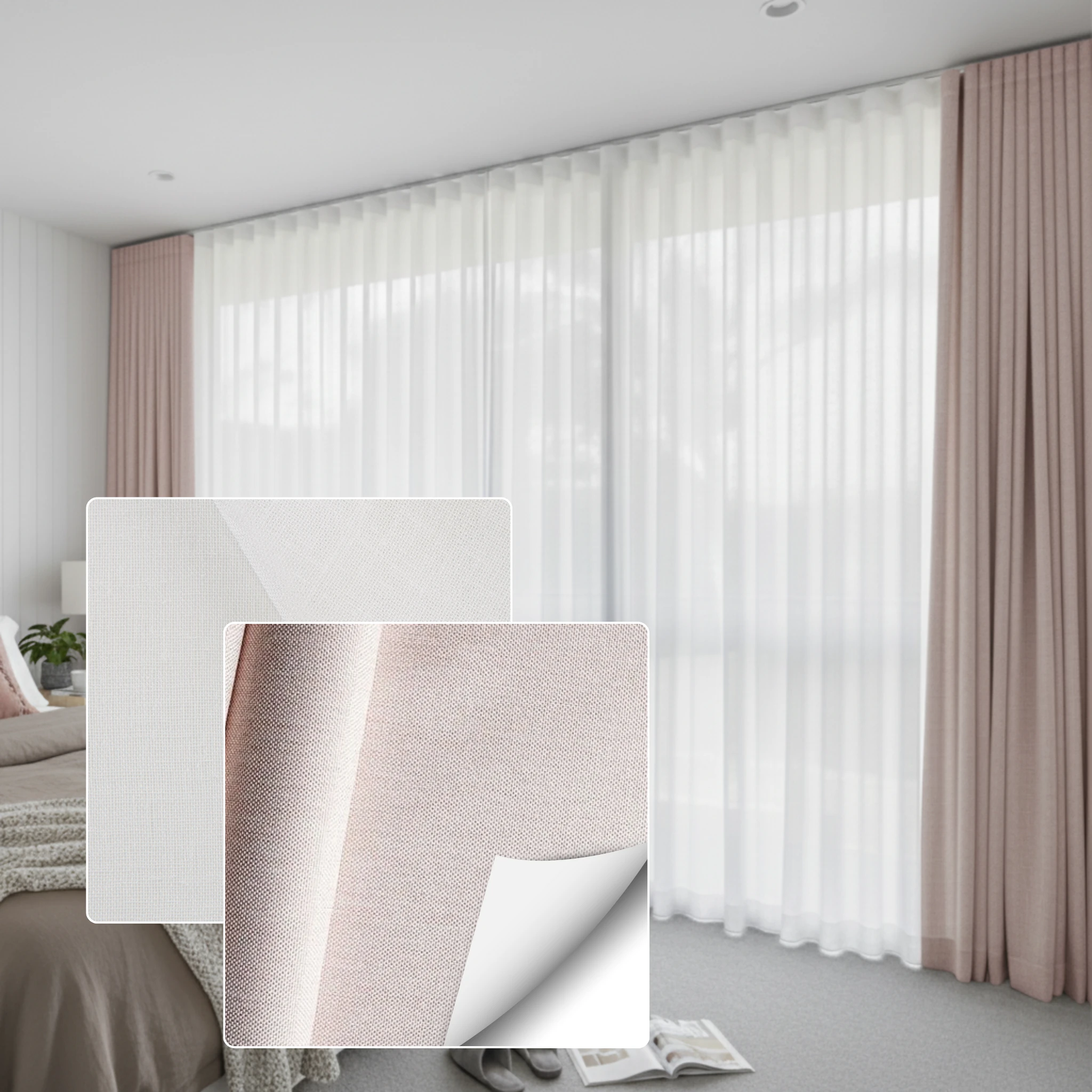 This double curtain combines two fabric types. The Bali Pearl is a sheer curtain fabric selected for softness texture and light diffusion. The Galaxy Dusk is a blockout curtain fabric designed for privacy room darkening and insulation. This combination gives you a layered look with practical performance without needing separate window furnishings.