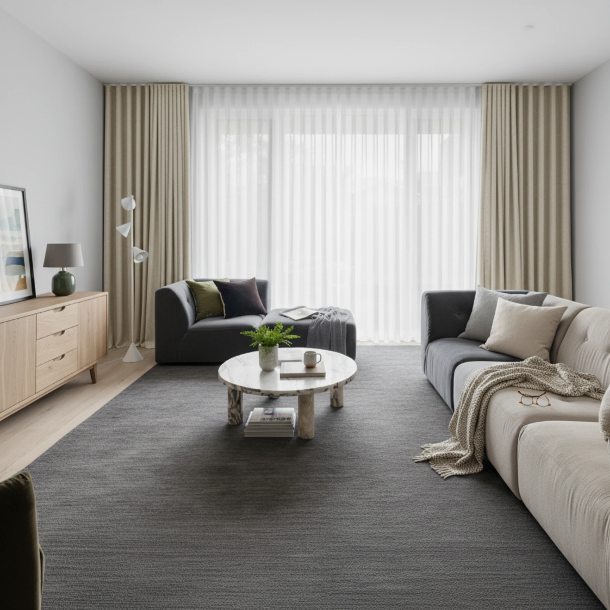 This is a double curtain system made with two layers installed on individual tracks. One layer features the Bali Pearl sheer curtain, designed to gently filter daylight, soften the space and provide comfortable daytime privacy. The other layer is the Soleil Oatmeal blockout curtain, which delivers night-time privacy, darkness and added insulation. Together, the two layers give you flexible light control and a beautifully layered finish that suits modern Australian homes.