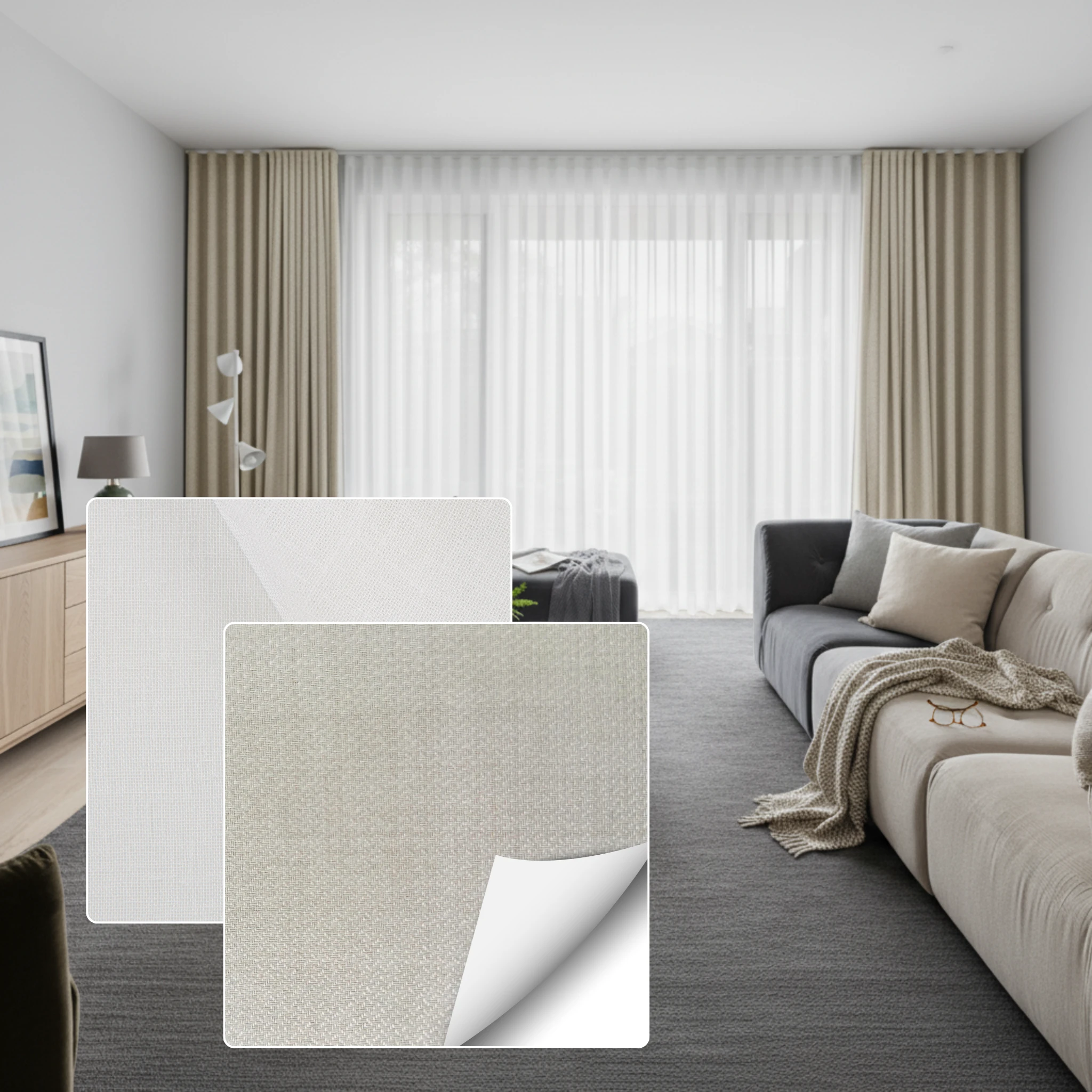 This double curtain combines two fabric types. The Bali Pearl is a sheer curtain fabric selected for softness texture and light diffusion. The Soleil Oatmeal is a blockout curtain fabric designed for privacy room darkening and insulation. This combination gives you a layered look with practical performance without needing separate window furnishings.