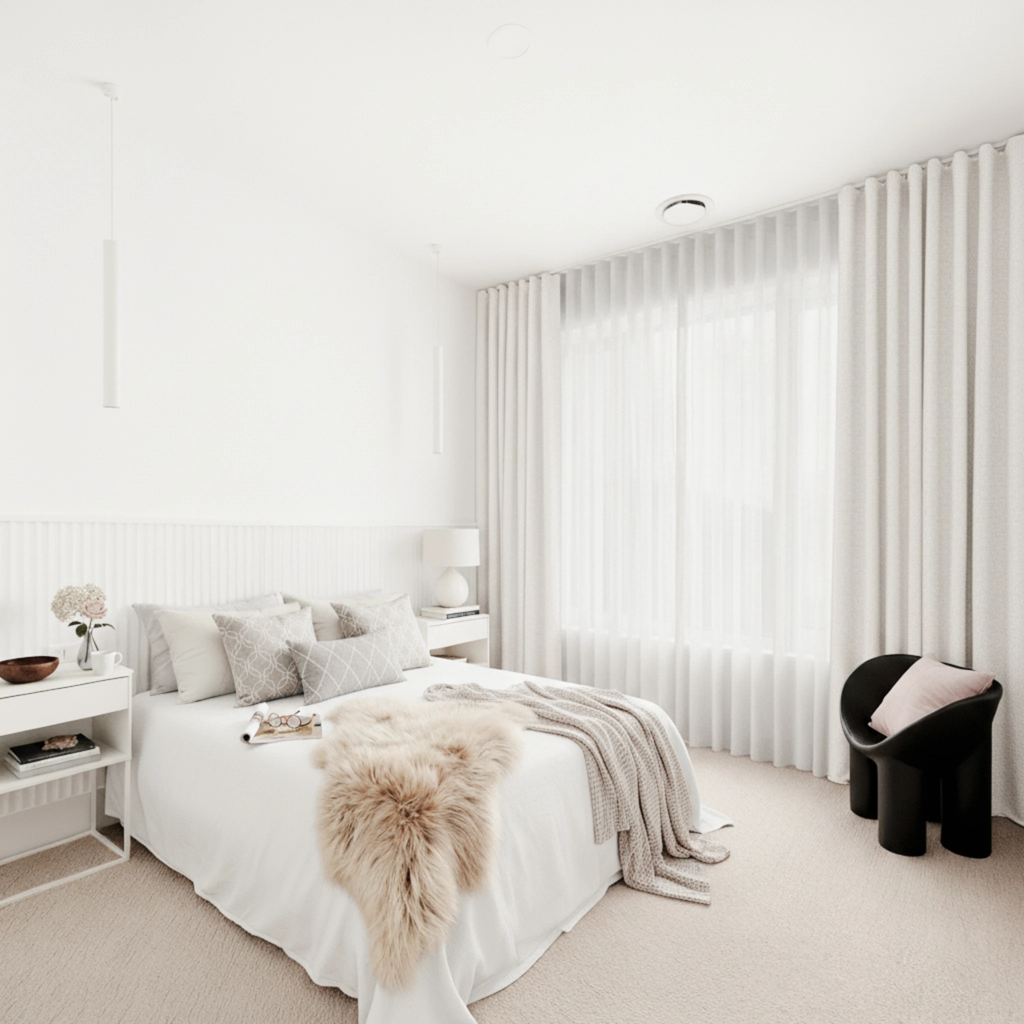 This is a double curtain system made with two layers installed on individual tracks. One layer features the Bali Snow sheer curtain, designed to gently filter daylight, soften the space and provide comfortable daytime privacy. The other layer is the Belmore Chalk blockout curtain, which delivers night-time privacy, darkness and added insulation. Together, the two layers give you flexible light control and a beautifully layered finish that suits modern Australian homes.