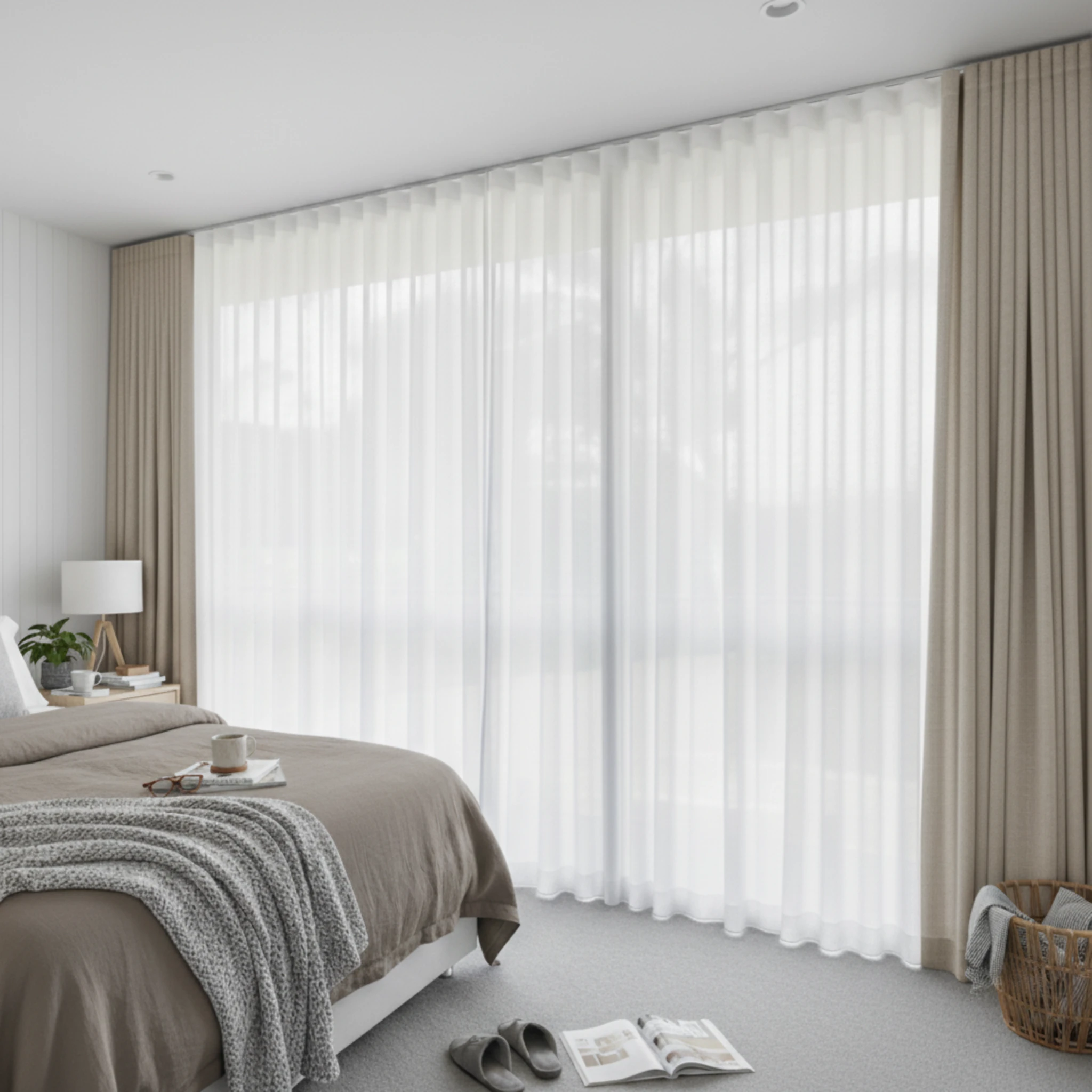 This is a double curtain system made with two layers installed on individual tracks. One layer features the Bali Snow sheer curtain, designed to gently filter daylight, soften the space and provide comfortable daytime privacy. The other layer is the Galaxy Pluto blockout curtain, which delivers night-time privacy, darkness and added insulation. Together, the two layers give you flexible light control and a beautifully layered finish that suits modern Australian homes.