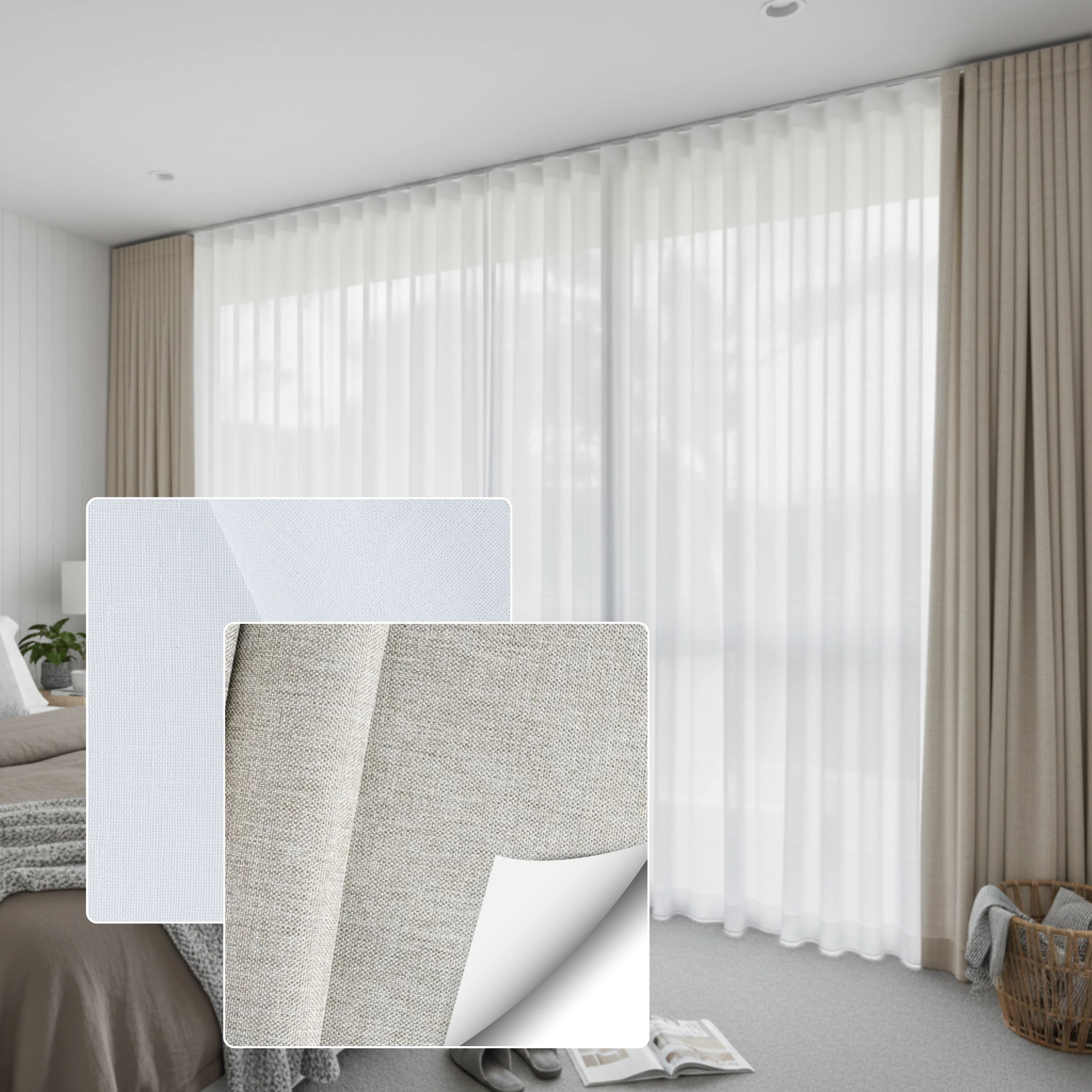 This double curtain combines two fabric types. The Bali Snow is a sheer curtain fabric selected for softness texture and light diffusion. The Galaxy Pluto is a blockout curtain fabric designed for privacy room darkening and insulation. This combination gives you a layered look with practical performance without needing separate window furnishings.