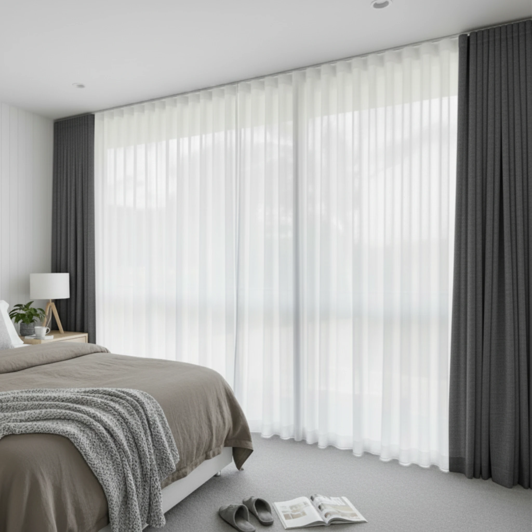 This is a double curtain system made with two layers installed on individual tracks. One layer features the Bali Snow sheer curtain, designed to gently filter daylight, soften the space and provide comfortable daytime privacy. The other layer is the Galaxy Saturn blockout curtain, which delivers night-time privacy, darkness and added insulation. Together, the two layers give you flexible light control and a beautifully layered finish that suits modern Australian homes.