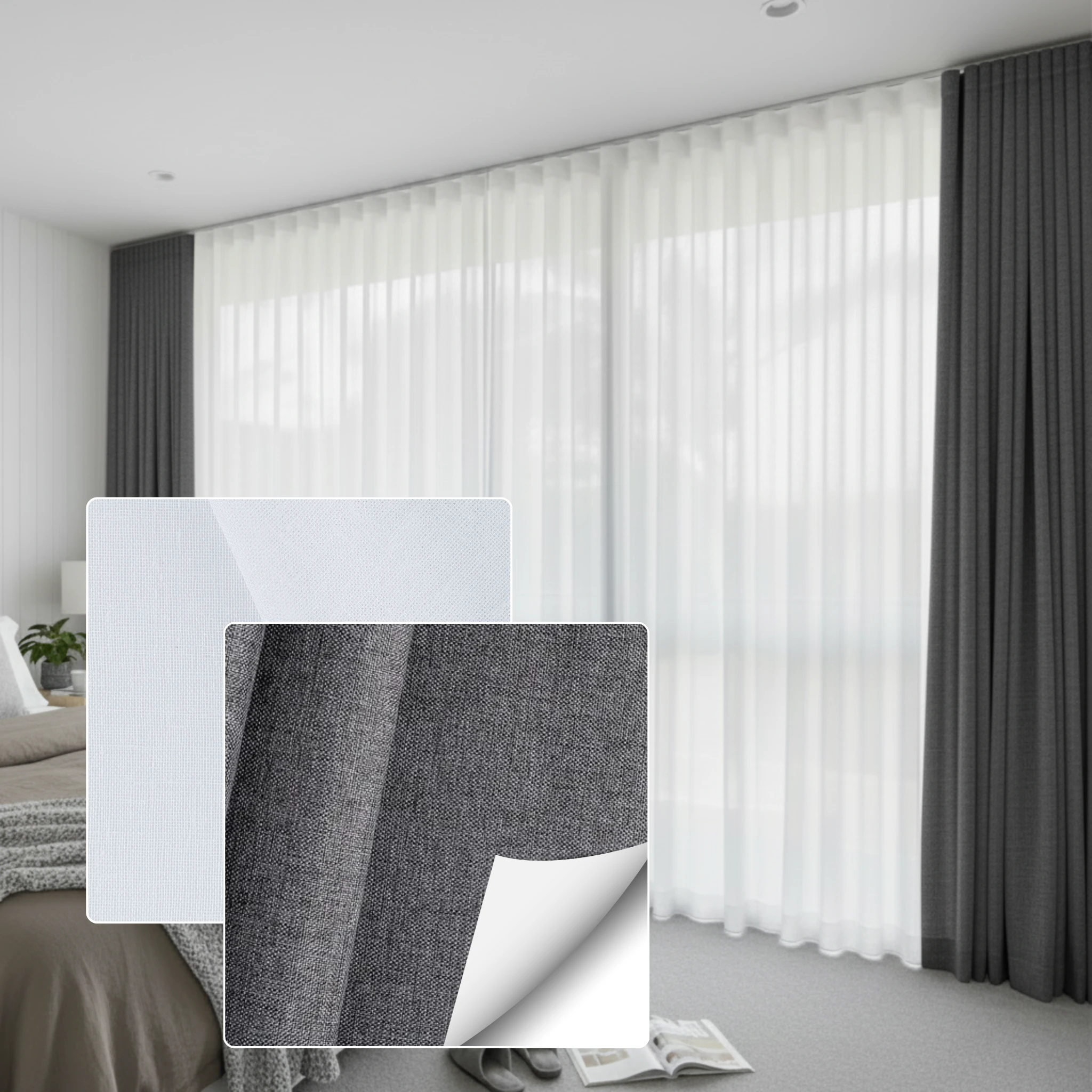 This double curtain combines two fabric types. The Bali Snow is a sheer curtain fabric selected for softness texture and light diffusion. The Galaxy Saturn is a blockout curtain fabric designed for privacy room darkening and insulation. This combination gives you a layered look with practical performance without needing separate window furnishings.