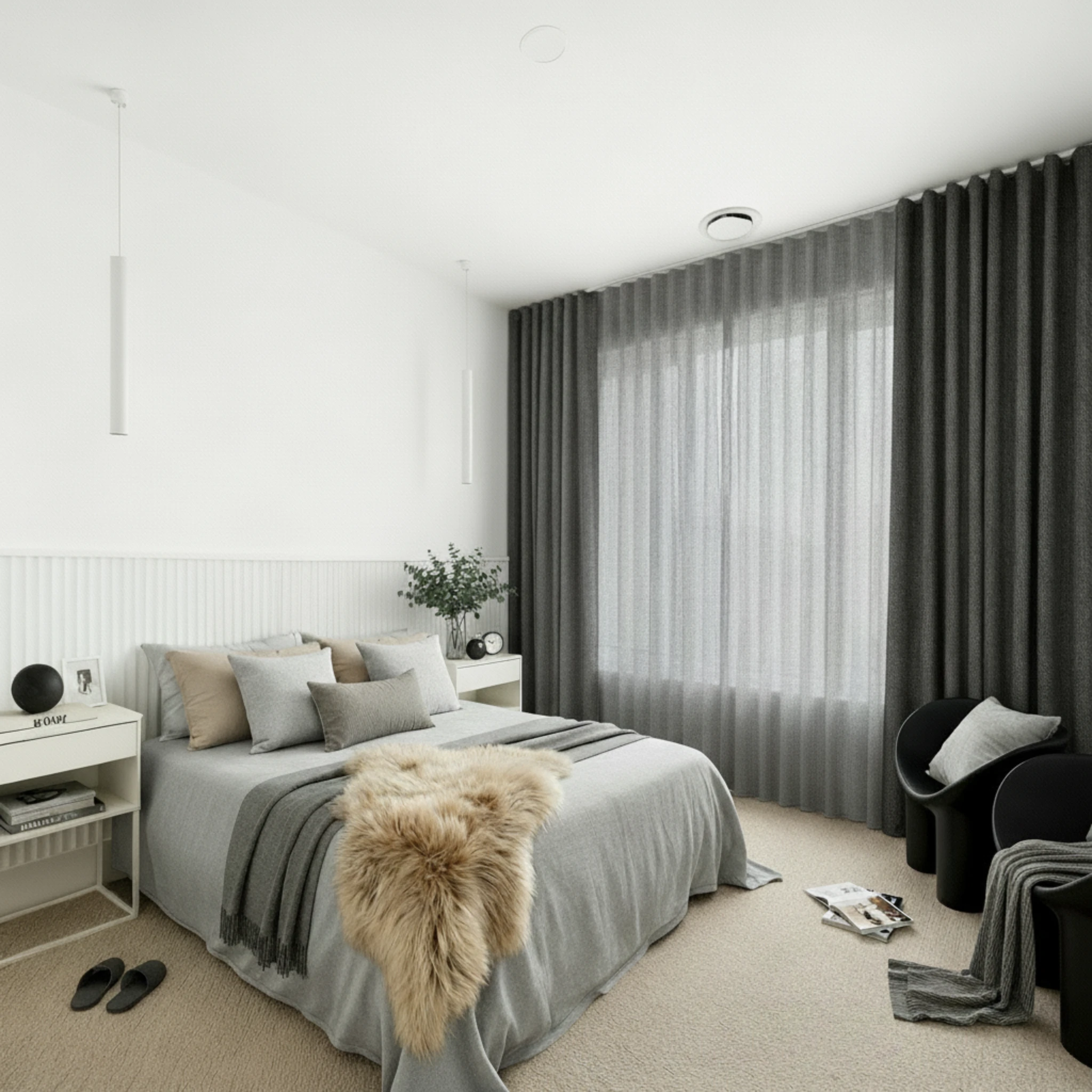 This is a double curtain system made with two layers installed on individual tracks. One layer features the Bali Storm sheer curtain, designed to gently filter daylight, soften the space and provide comfortable daytime privacy. The other layer is the Belmore Asphalt blockout curtain, which delivers night-time privacy, darkness and added insulation. Together, the two layers give you flexible light control and a beautifully layered finish that suits modern Australian homes.