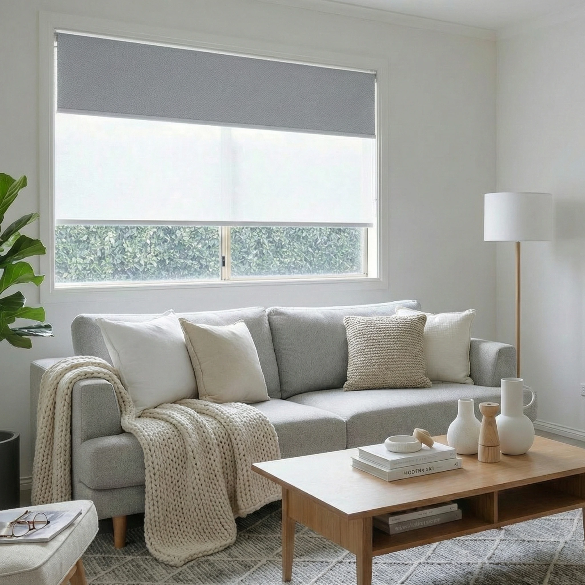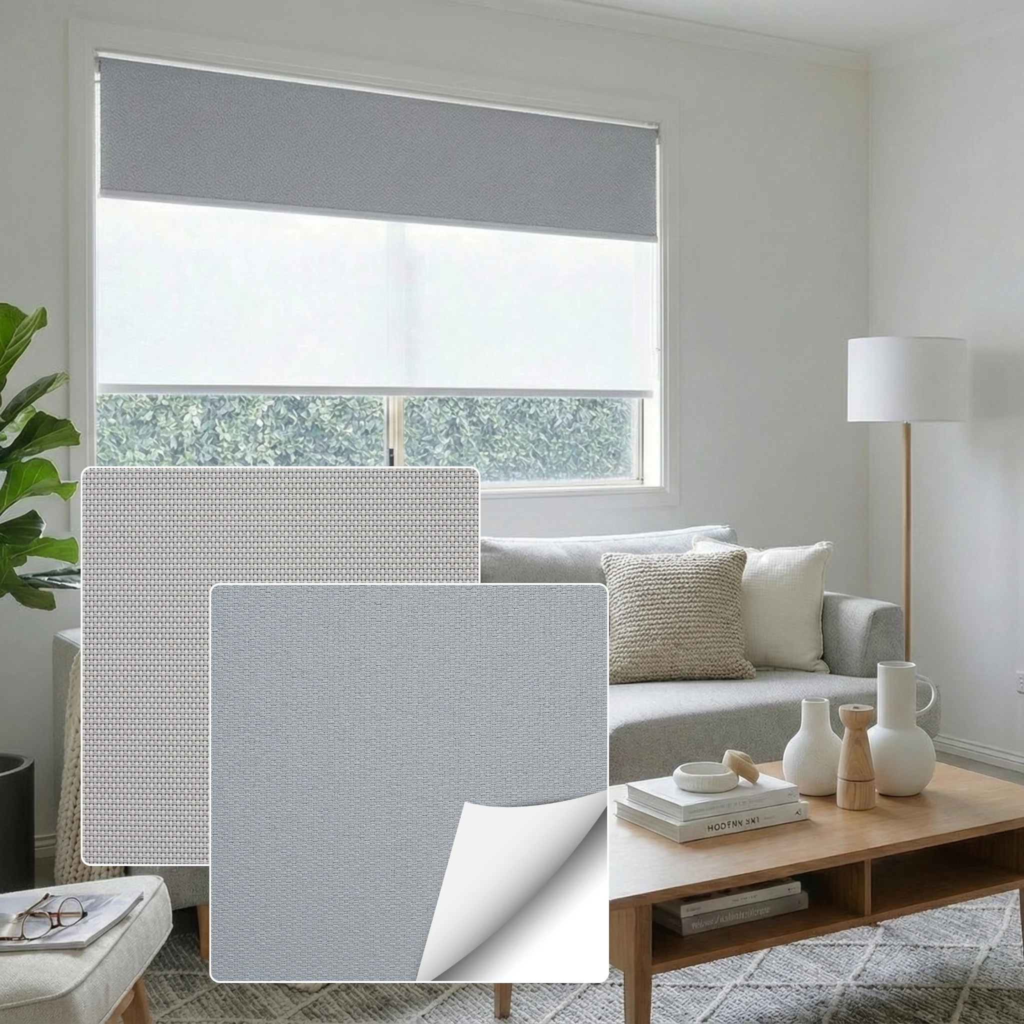 Bali Thunder Blockout + Aventus White Stone Sunscreen Double Roller Blind