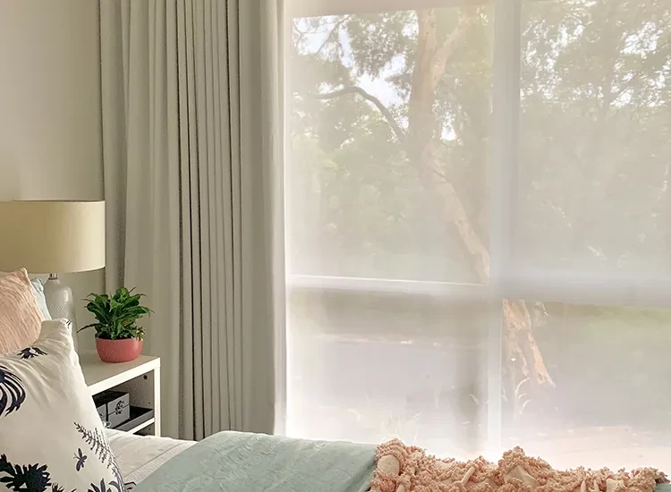 We suggest choosing a roller blind fabric that is a tonal-match or neutral colour when placing them behind a sheer curtain. Considering the sheer is at the front and is the star in the “good-looks department”, you don’t want to detract from that by installing a roller behind it that is in total contrast or distracts you from its beauty. Choosing a neutral blind fabric that blends with your walls or with the curtain itself will give you a stunning result. When it comes to the sheer curtain fabric – our Bali range has some gorgeous colours to choose from and their linen appearance works with many different decorative styles looks amazing in any interior.