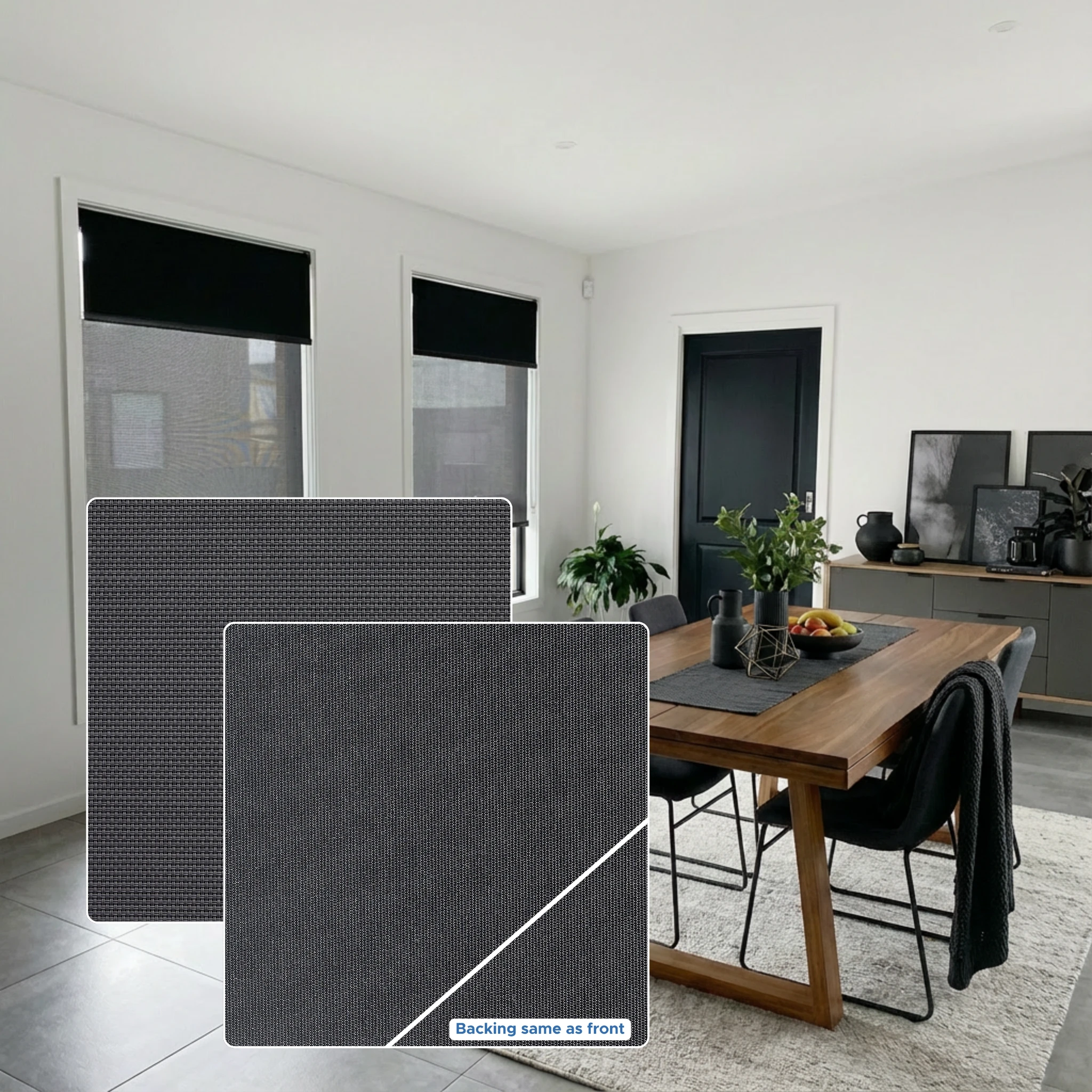 Charlotte Black Blockout + Aventus Pewter Sunscreen Double Roller Blind