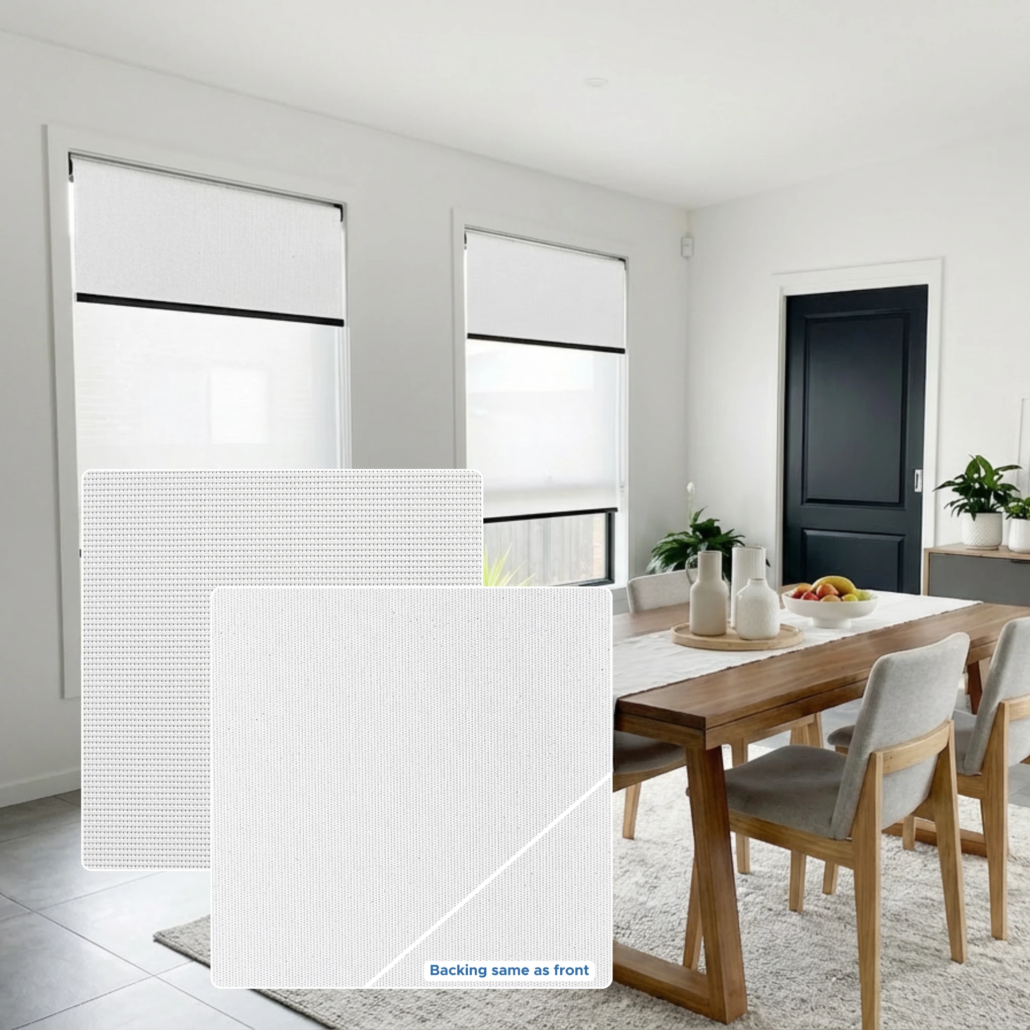 Charlotte Warm White Blockout + Aventus Ice Sunscreen Double Roller Blind