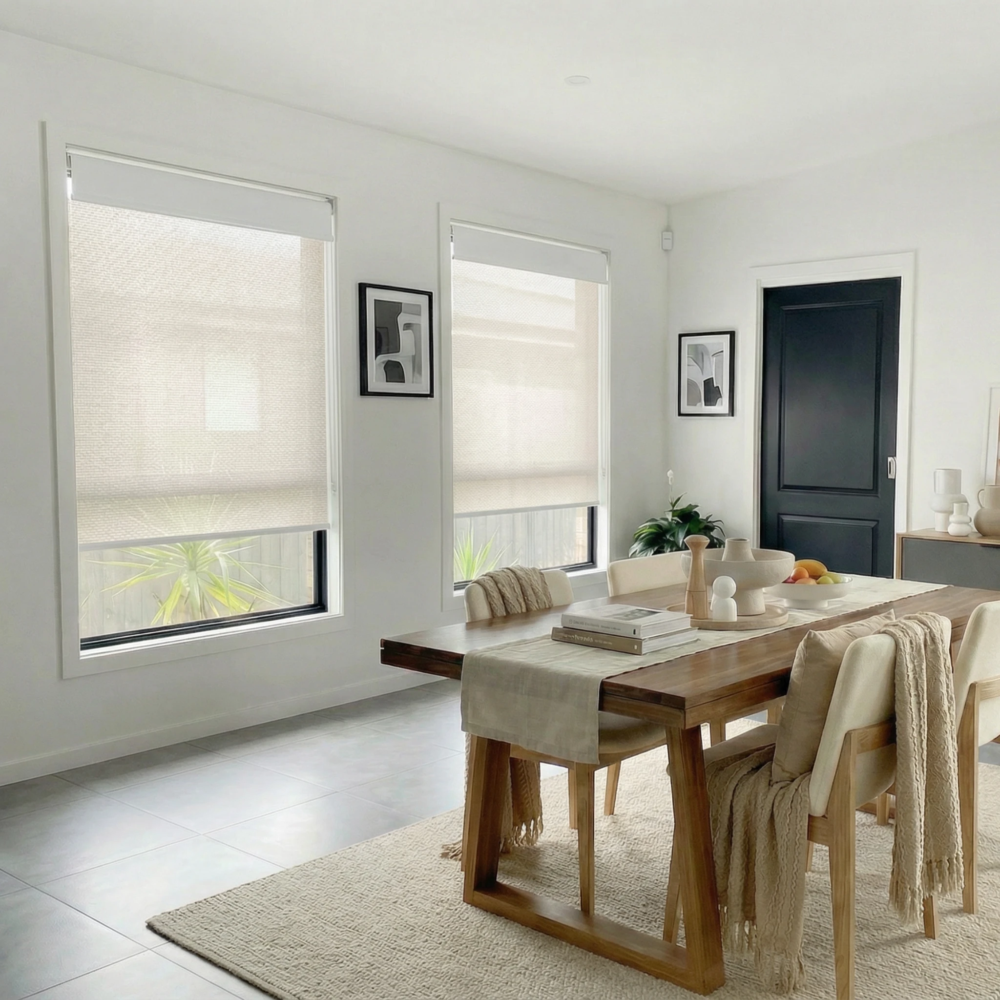 Charlotte Warm White Blockout + Aventus White Linen Sunscreen Double Roller Blind