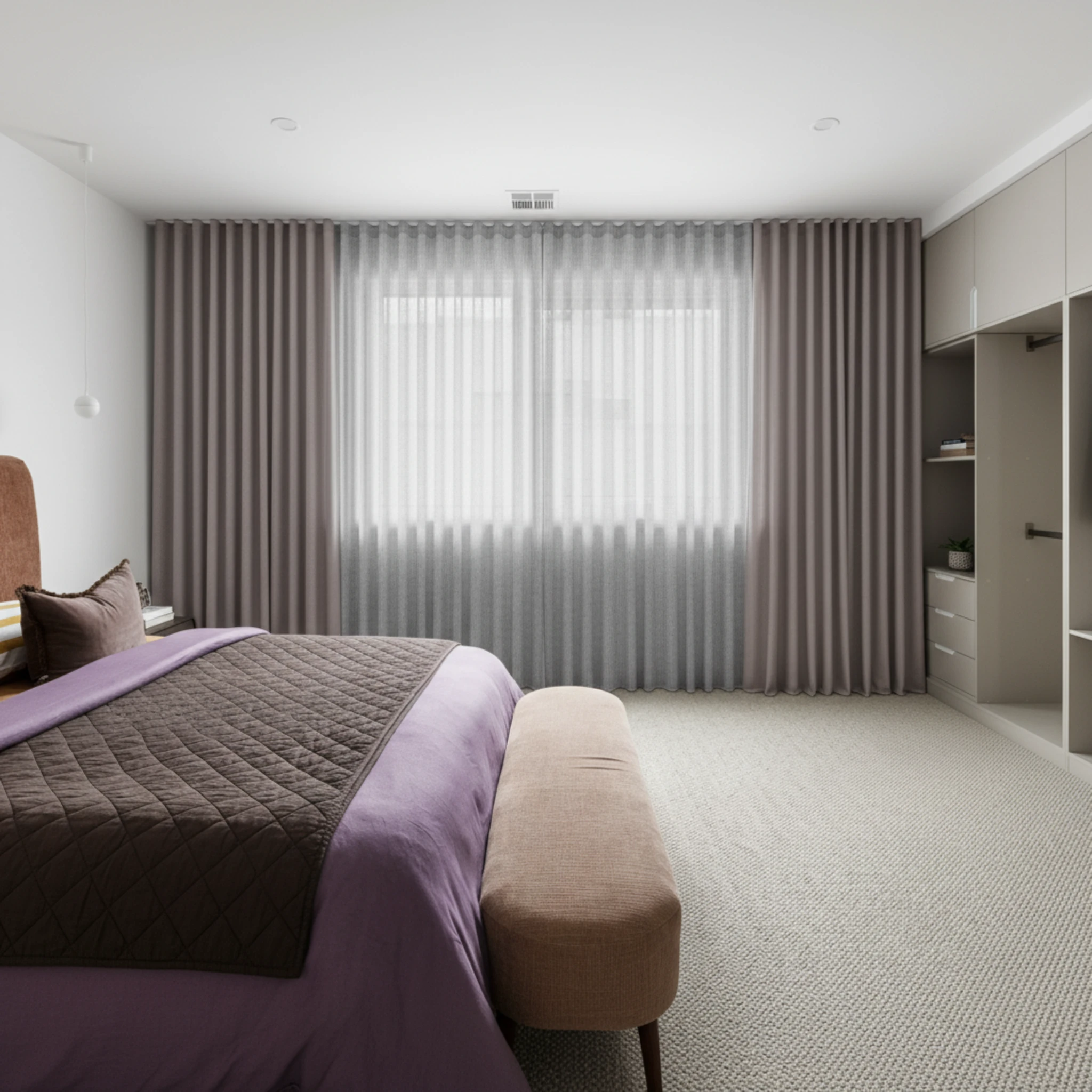 This is a double curtain system made with two layers installed on individual tracks. One layer features the Chios Asphalt sheer curtain, designed to gently filter daylight, soften the space and provide comfortable daytime privacy. The other layer is the Epic Cobblestone blockout curtain, which delivers night-time privacy, darkness and added insulation. Together, the two layers give you flexible light control and a beautifully layered finish that suits modern Australian homes.