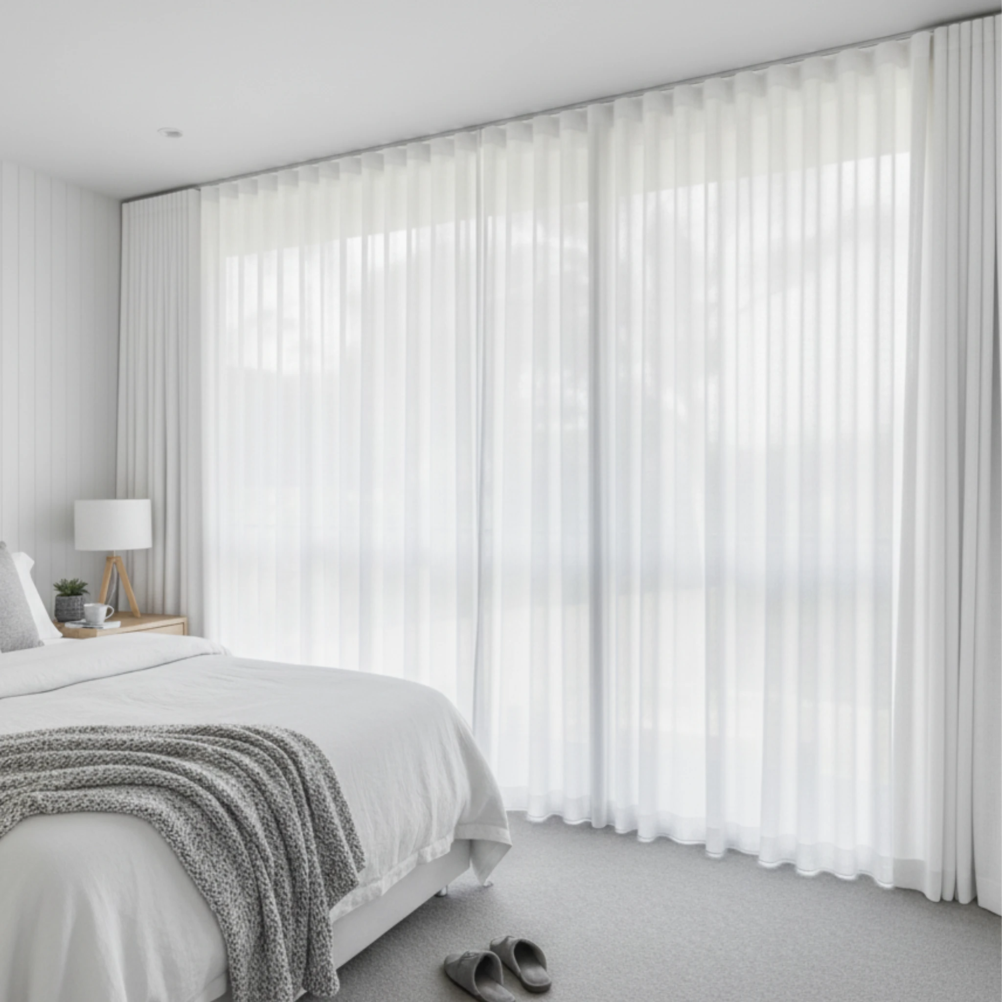 This is a double curtain system made with two layers installed on individual tracks. One layer features the Chios Moonlight sheer curtain, designed to gently filter daylight, soften the space and provide comfortable daytime privacy. The other layer is the Belmore Chalk blockout curtain, which delivers night-time privacy, darkness and added insulation. Together, the two layers give you flexible light control and a beautifully layered finish that suits modern Australian homes.
