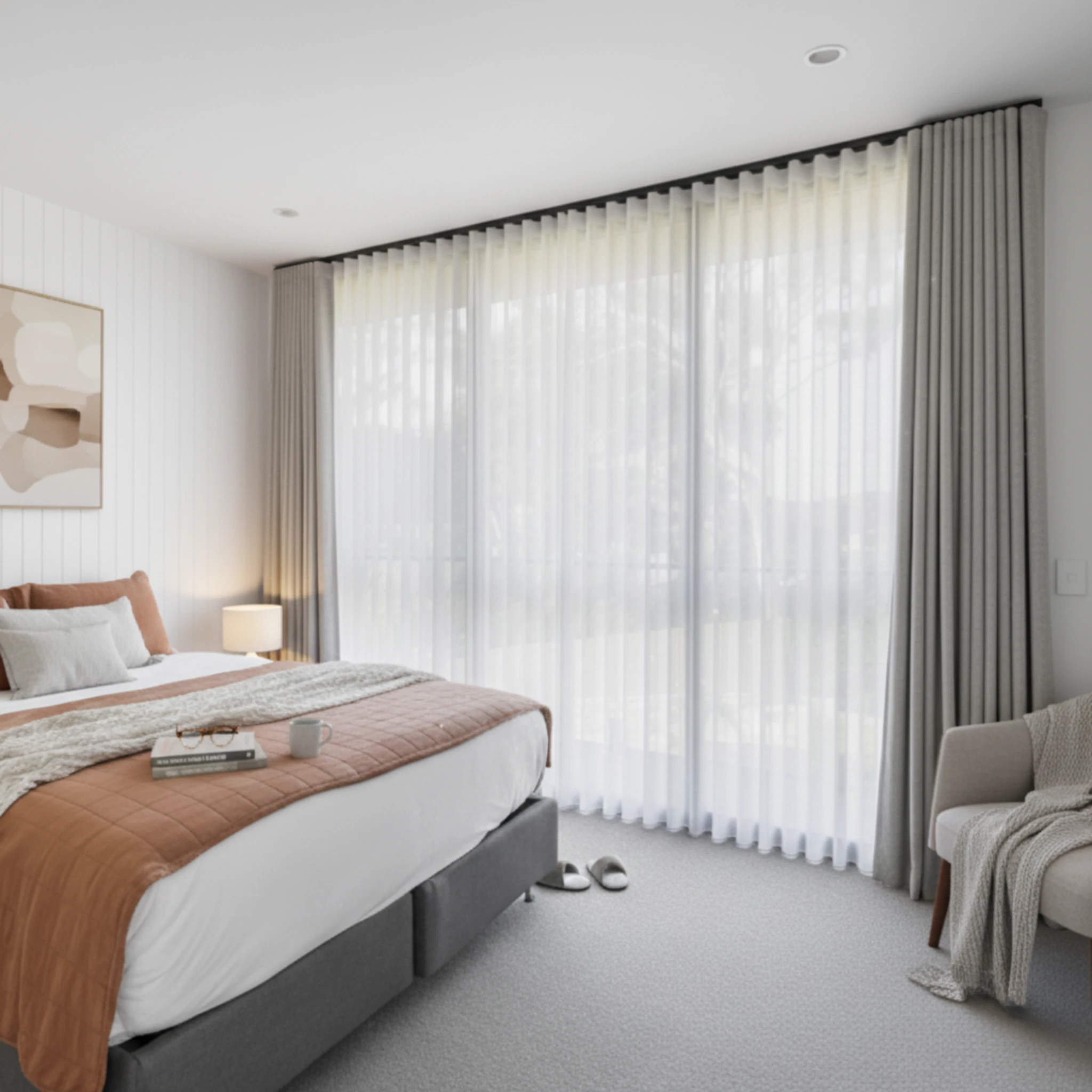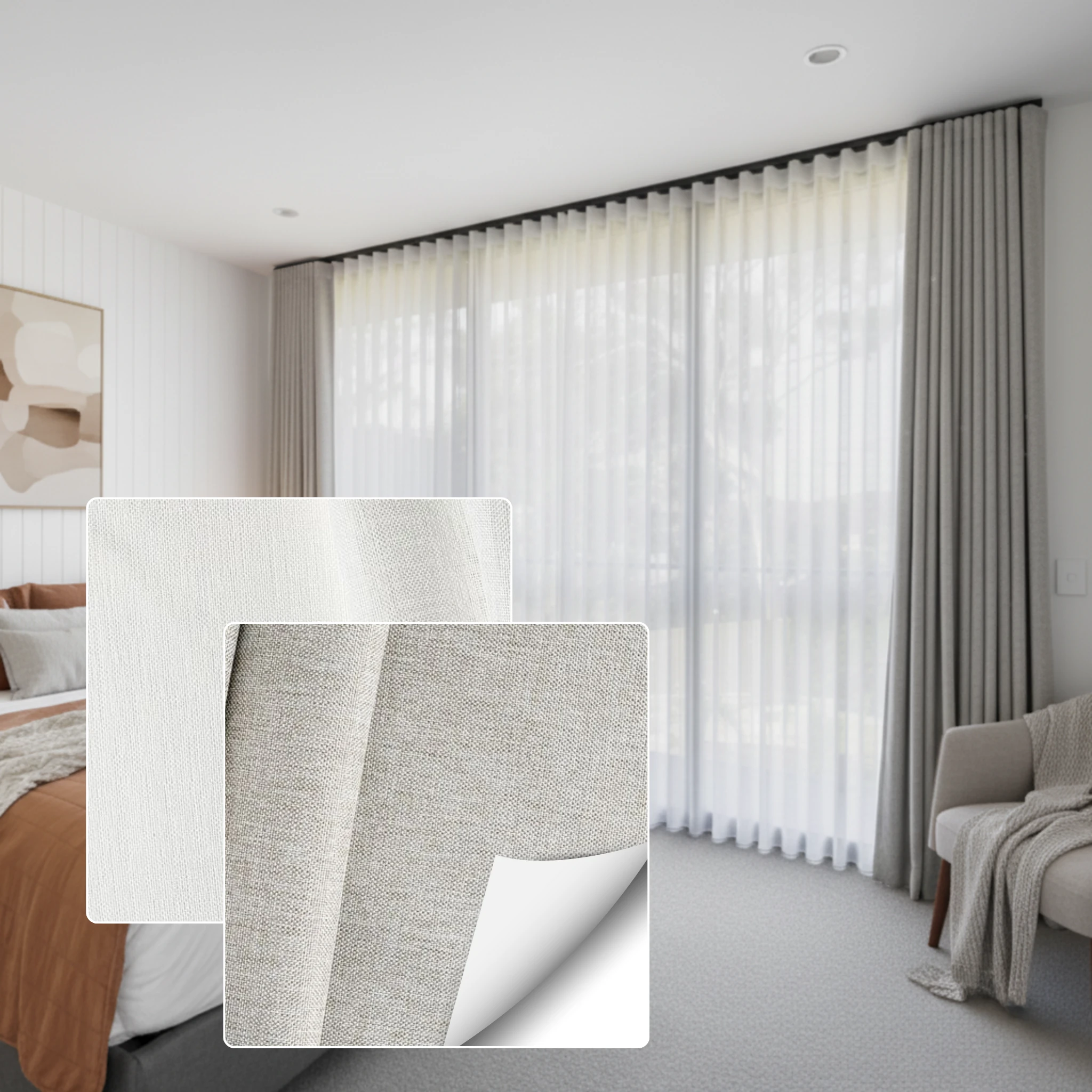 This is a double curtain system made with two layers installed on individual tracks. One layer features the Chios Moonlight sheer curtain, designed to gently filter daylight, soften the space and provide comfortable daytime privacy. The other layer is the Galaxy Pluto blockout curtain, which delivers night-time privacy, darkness and added insulation. Together, the two layers give you flexible light control and a beautifully layered finish that suits modern Australian homes.