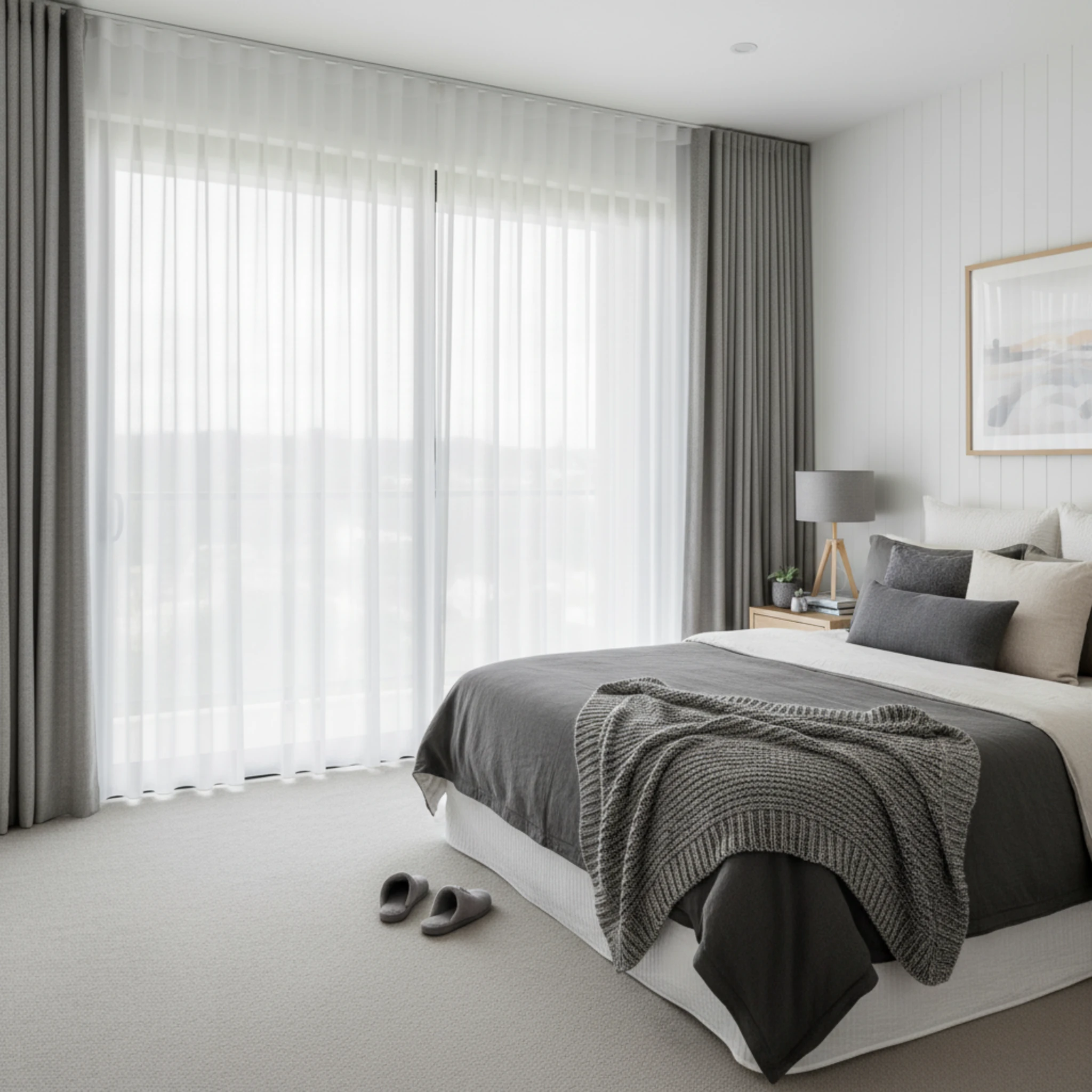 This is a double curtain system made with two layers installed on individual tracks. One layer features the Chios Moonlight sheer curtain, designed to gently filter daylight, soften the space and provide comfortable daytime privacy. The other layer is the Soleil Buff blockout curtain, which delivers night-time privacy, darkness and added insulation. Together, the two layers give you flexible light control and a beautifully layered finish that suits modern Australian homes.
