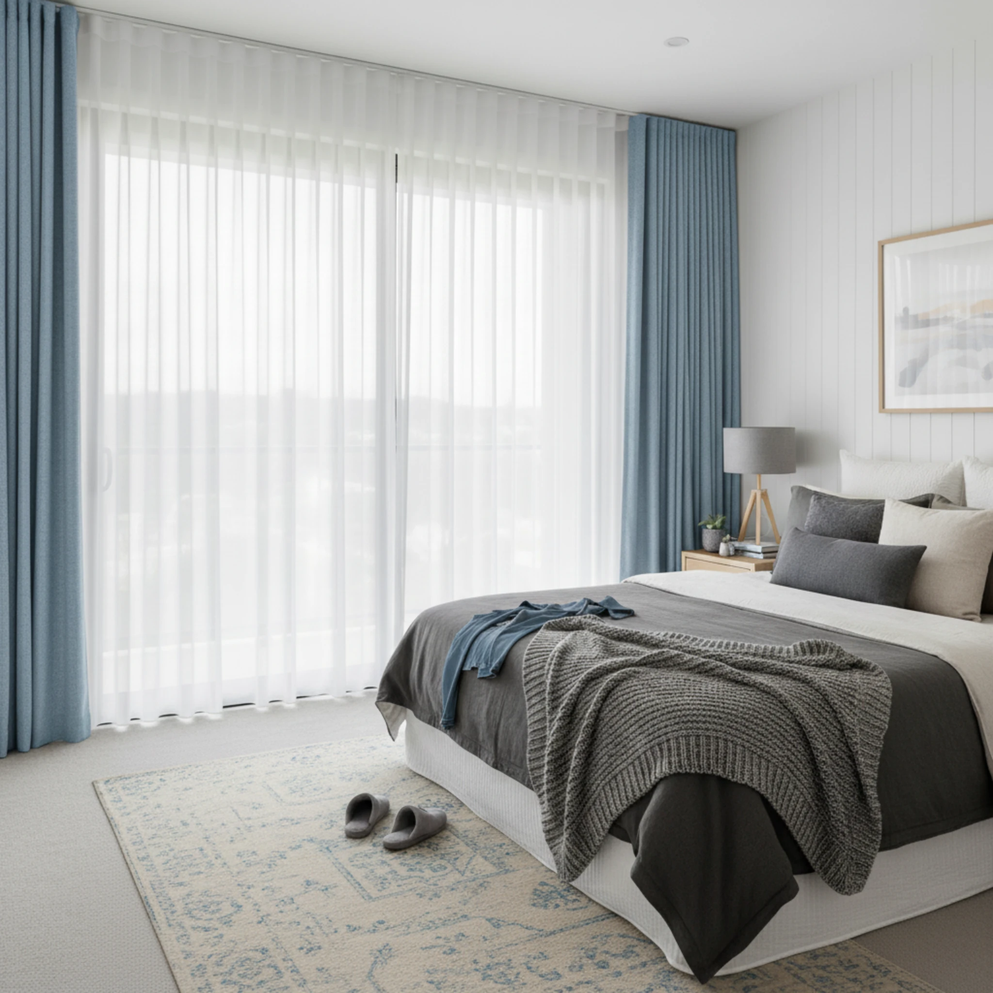 This is a double curtain system made with two layers installed on individual tracks. One layer features the Chios Moonlight sheer curtain, designed to gently filter daylight, soften the space and provide comfortable daytime privacy. The other layer is the Soleil Sky blockout curtain, which delivers night-time privacy, darkness and added insulation. Together, the two layers give you flexible light control and a beautifully layered finish that suits modern Australian homes.