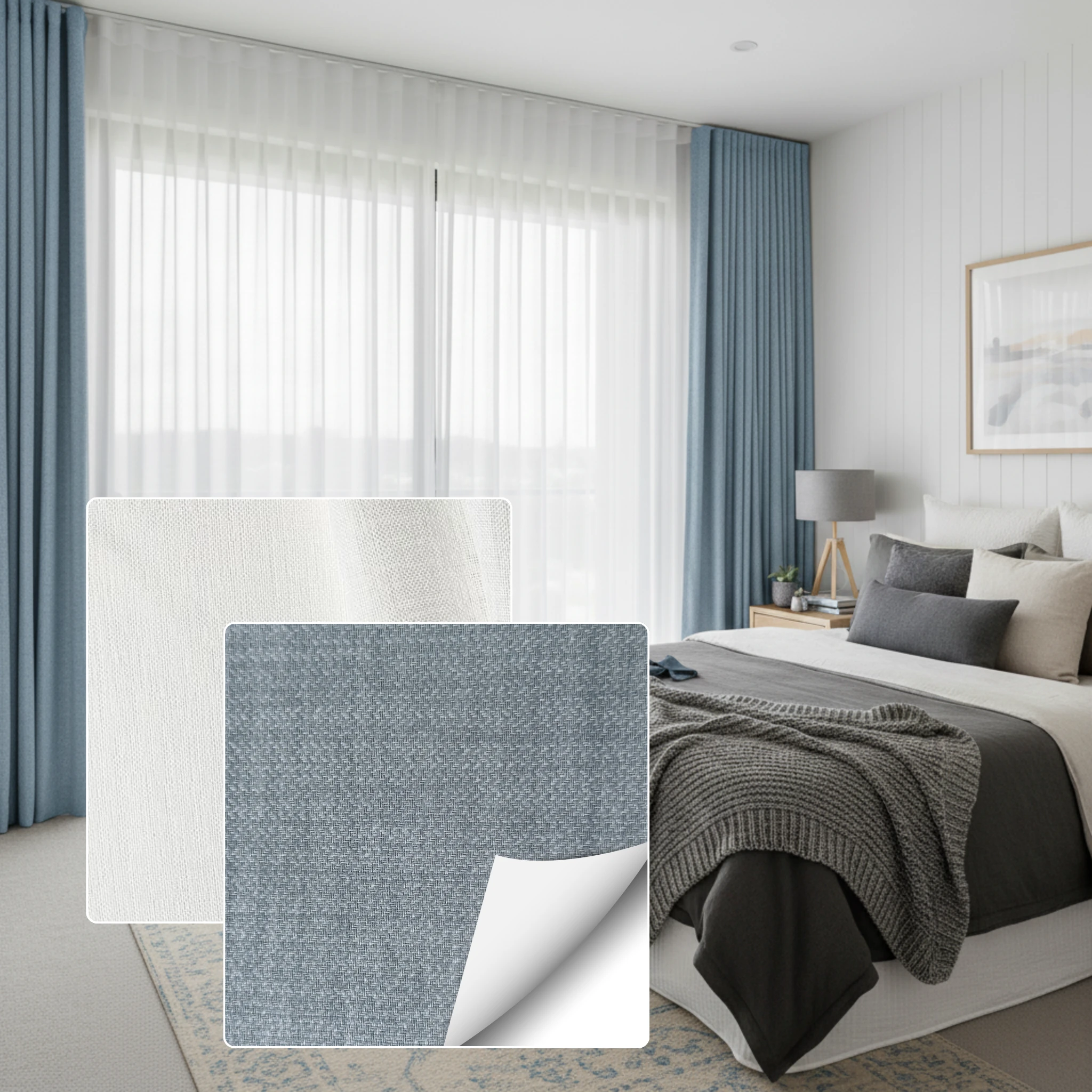 This double curtain combines two fabric types. The Chios Moonlight is a sheer curtain fabric selected for softness texture and light diffusion. The Soleil Sky is a blockout curtain fabric designed for privacy room darkening and insulation. This combination gives you a layered look with practical performance without needing separate window furnishings.