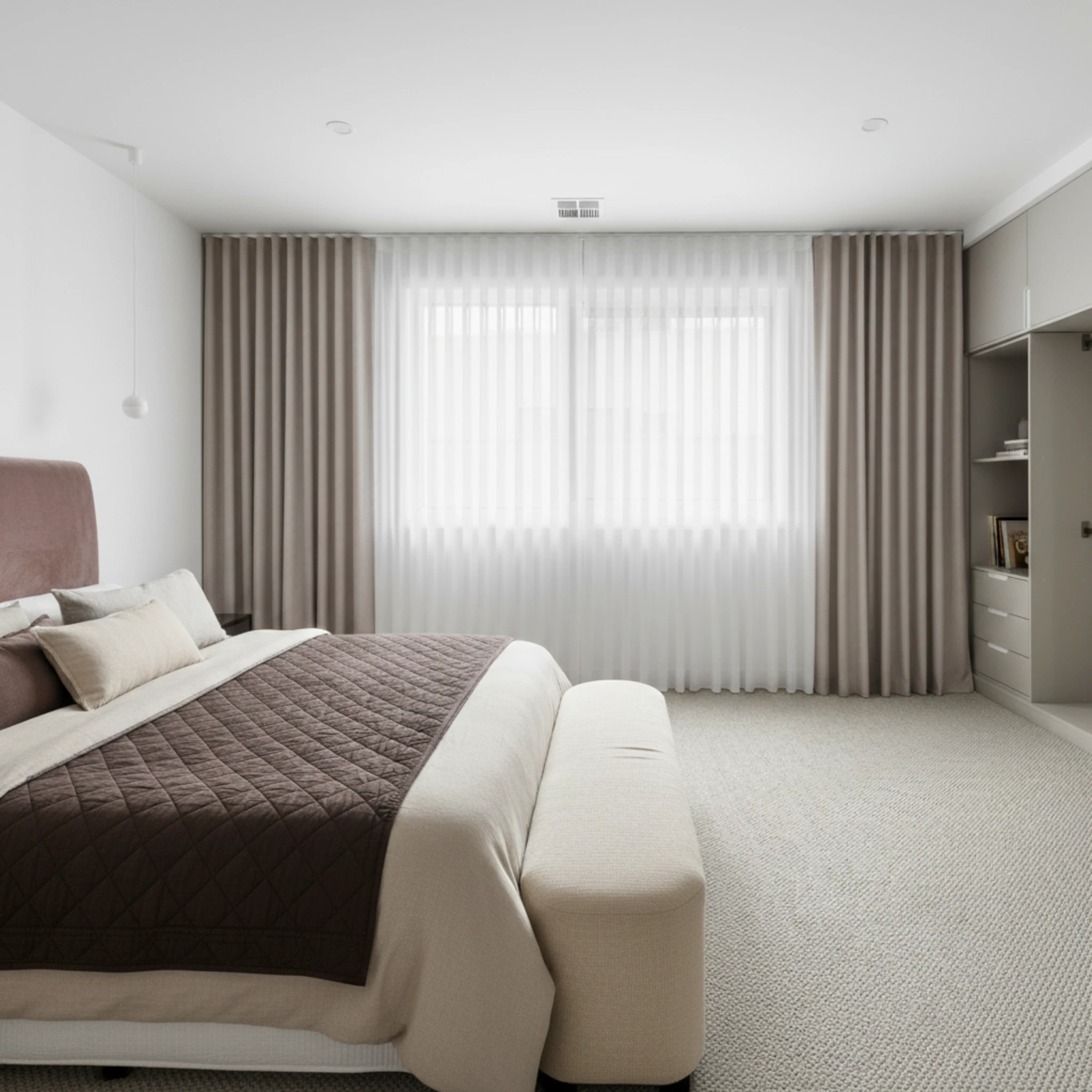 This is a double curtain system made with two layers installed on individual tracks. One layer features the Chios Quartz sheer curtain, designed to gently filter daylight, soften the space and provide comfortable daytime privacy. The other layer is the Epic Putty blockout curtain, which delivers night-time privacy, darkness and added insulation. Together, the two layers give you flexible light control and a beautifully layered finish that suits modern Australian homes.