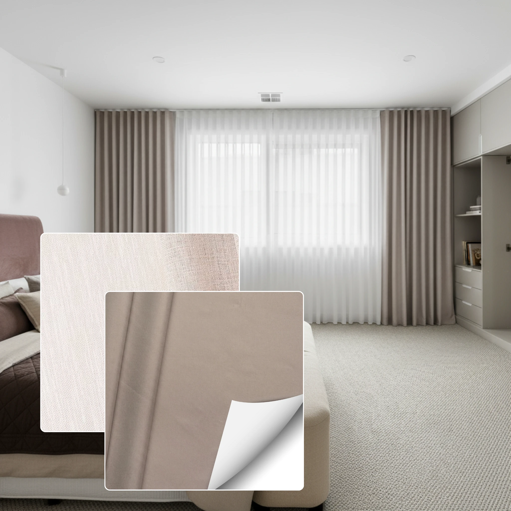 This double curtain combines two fabric types. The Chios Quartz is a sheer curtain fabric selected for softness texture and light diffusion. The Epic Putty is a blockout curtain fabric designed for privacy room darkening and insulation. This combination gives you a layered look with practical performance without needing separate window furnishings.