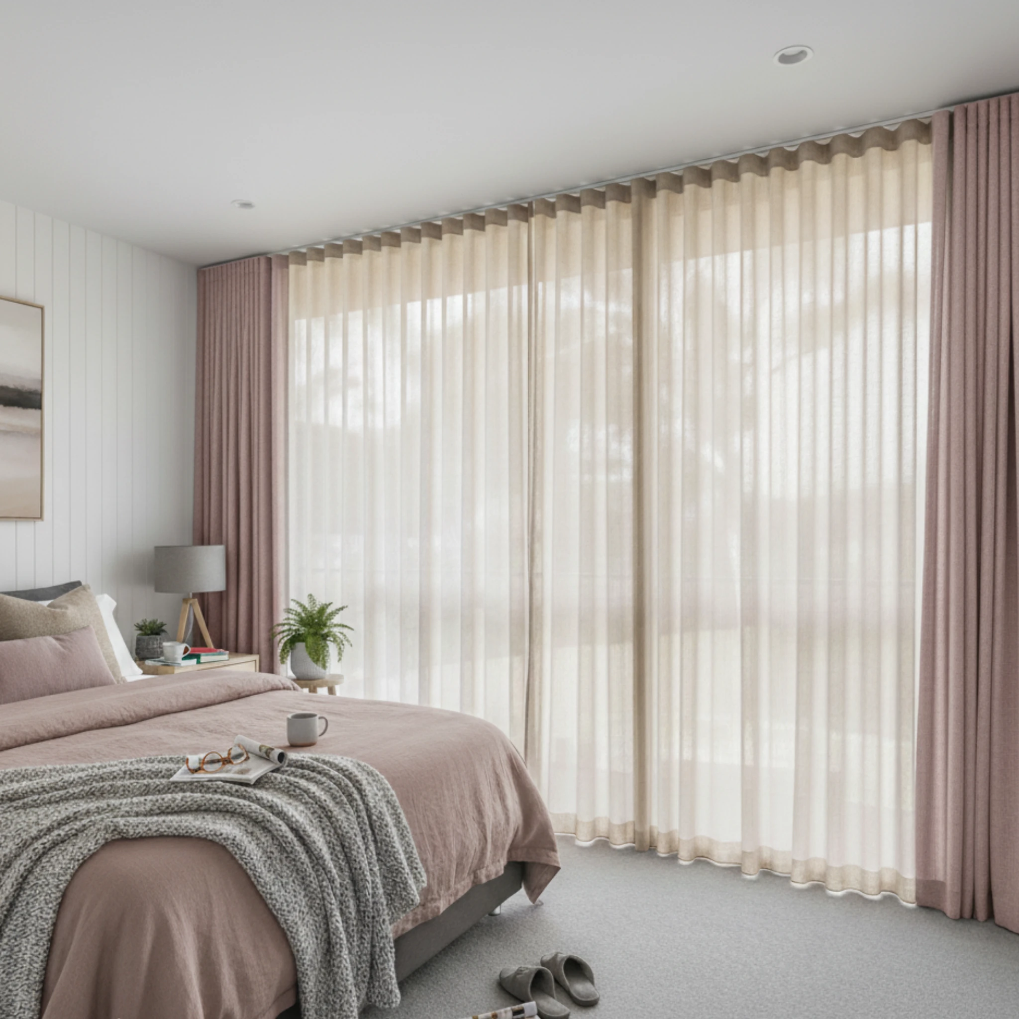 This is a double curtain system made with two layers installed on individual tracks. One layer features the Chios Quartz sheer curtain, designed to gently filter daylight, soften the space and provide comfortable daytime privacy. The other layer is the Soleil Blush blockout curtain, which delivers night-time privacy, darkness and added insulation. Together, the two layers give you flexible light control and a beautifully layered finish that suits modern Australian homes.