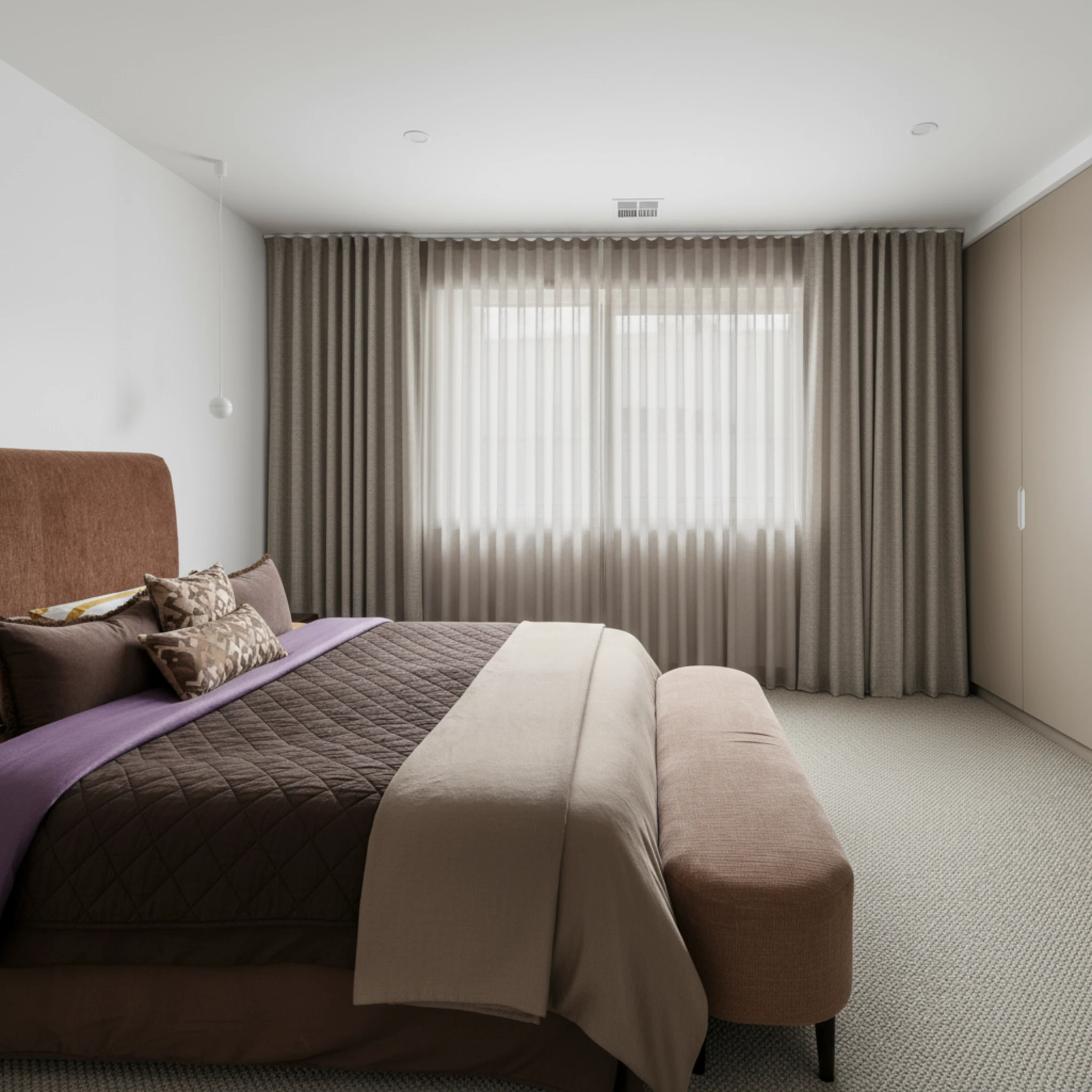 This is a double curtain system made with two layers installed on individual tracks. One layer features the Chios Sable sheer curtain, designed to gently filter daylight, soften the space and provide comfortable daytime privacy. The other layer is the Epic Putty blockout curtain, which delivers night-time privacy, darkness and added insulation. Together, the two layers give you flexible light control and a beautifully layered finish that suits modern Australian homes.