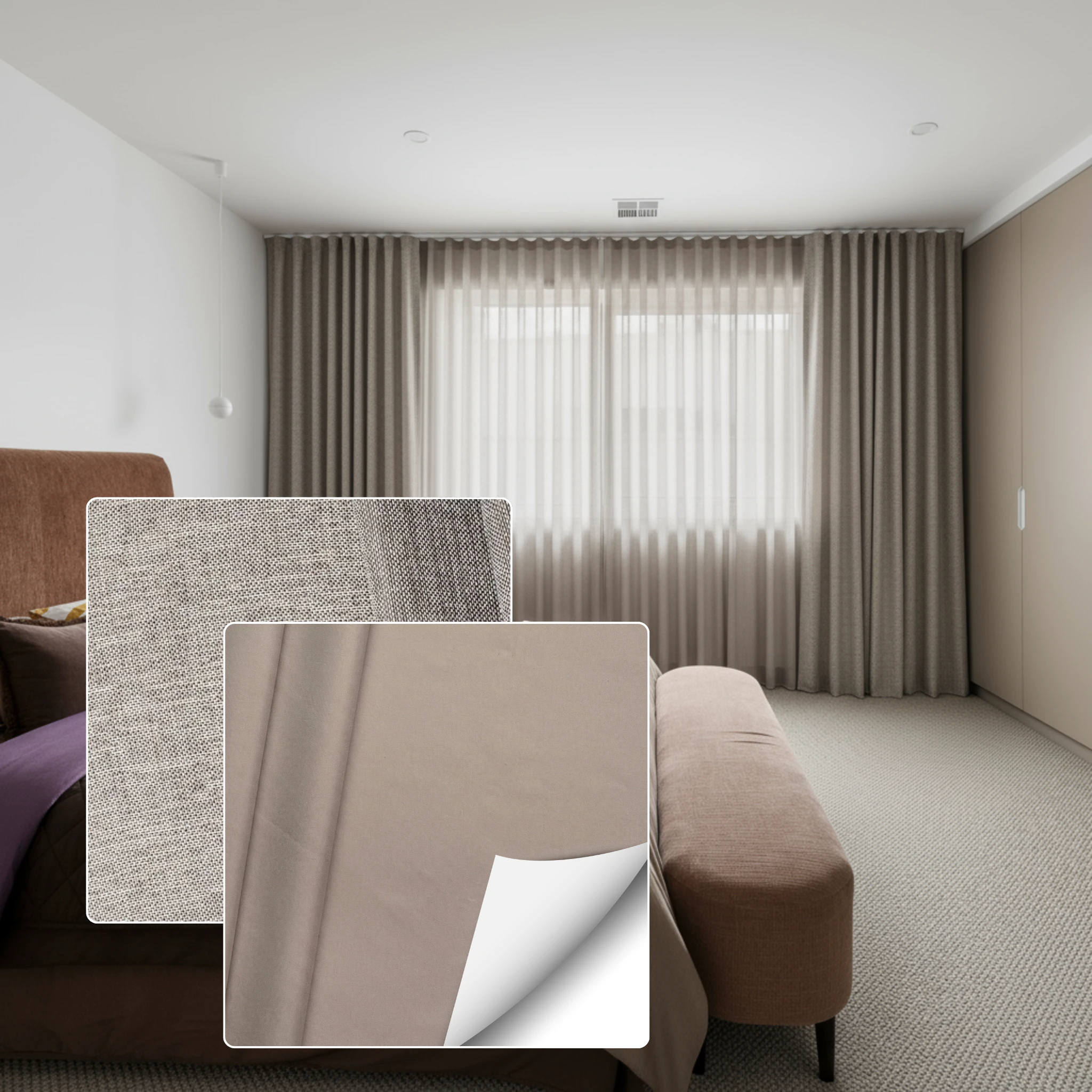 This double curtain combines two fabric types. The Chios Sable is a sheer curtain fabric selected for softness texture and light diffusion. The Epic Putty is a blockout curtain fabric designed for privacy room darkening and insulation. This combination gives you a layered look with practical performance without needing separate window furnishings.