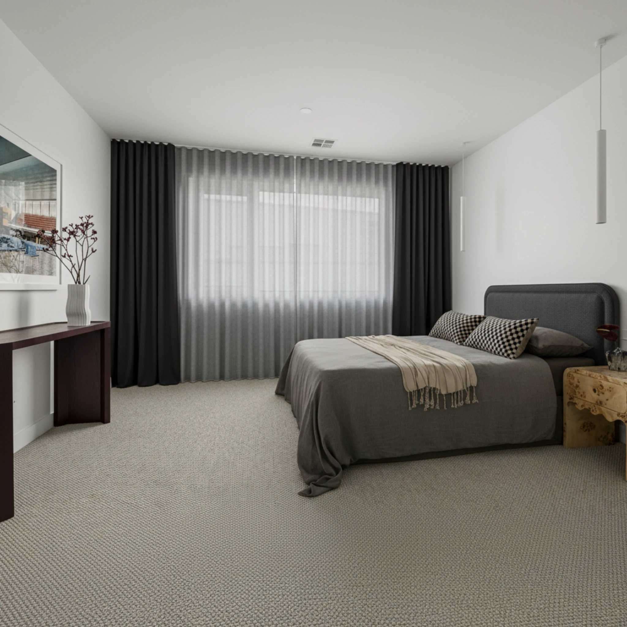 This is a double curtain system made with two layers installed on individual tracks. One layer features the Coast Charcoal sheer curtain, designed to gently filter daylight, soften the space and provide comfortable daytime privacy. The other layer is the Epic Ebony blockout curtain, which delivers night-time privacy, darkness and added insulation. Together, the two layers give you flexible light control and a beautifully layered finish that suits modern Australian homes.
