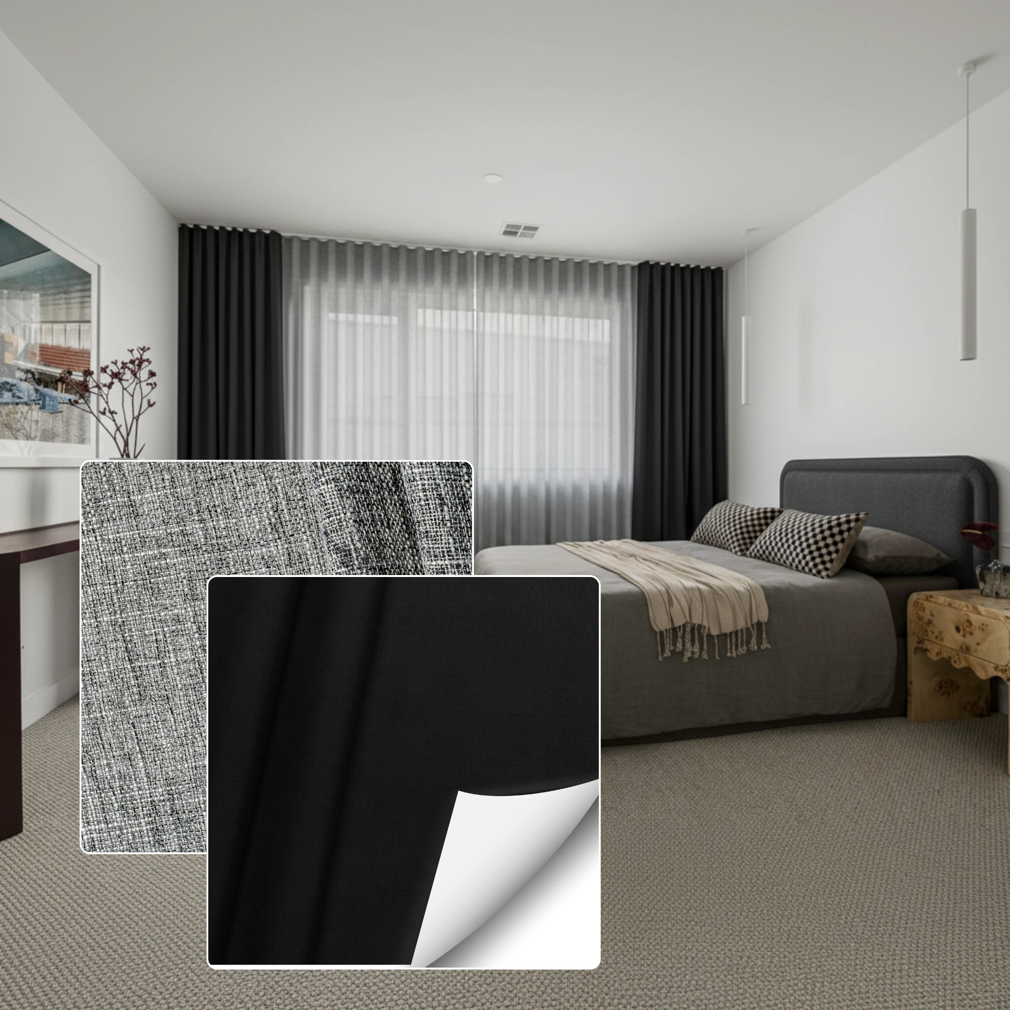 Double curtains give you total flexibility across the day and night. During the day you can use the Coast Charcoal sheer layer to brighten the room while still softening glare and giving daytime privacy. At night you close the Epic Ebony blockout layer for full privacy stronger insulation and a darker space for better sleep. If you want one window solution that is both decorative and practical this pairing is the best of both worlds.