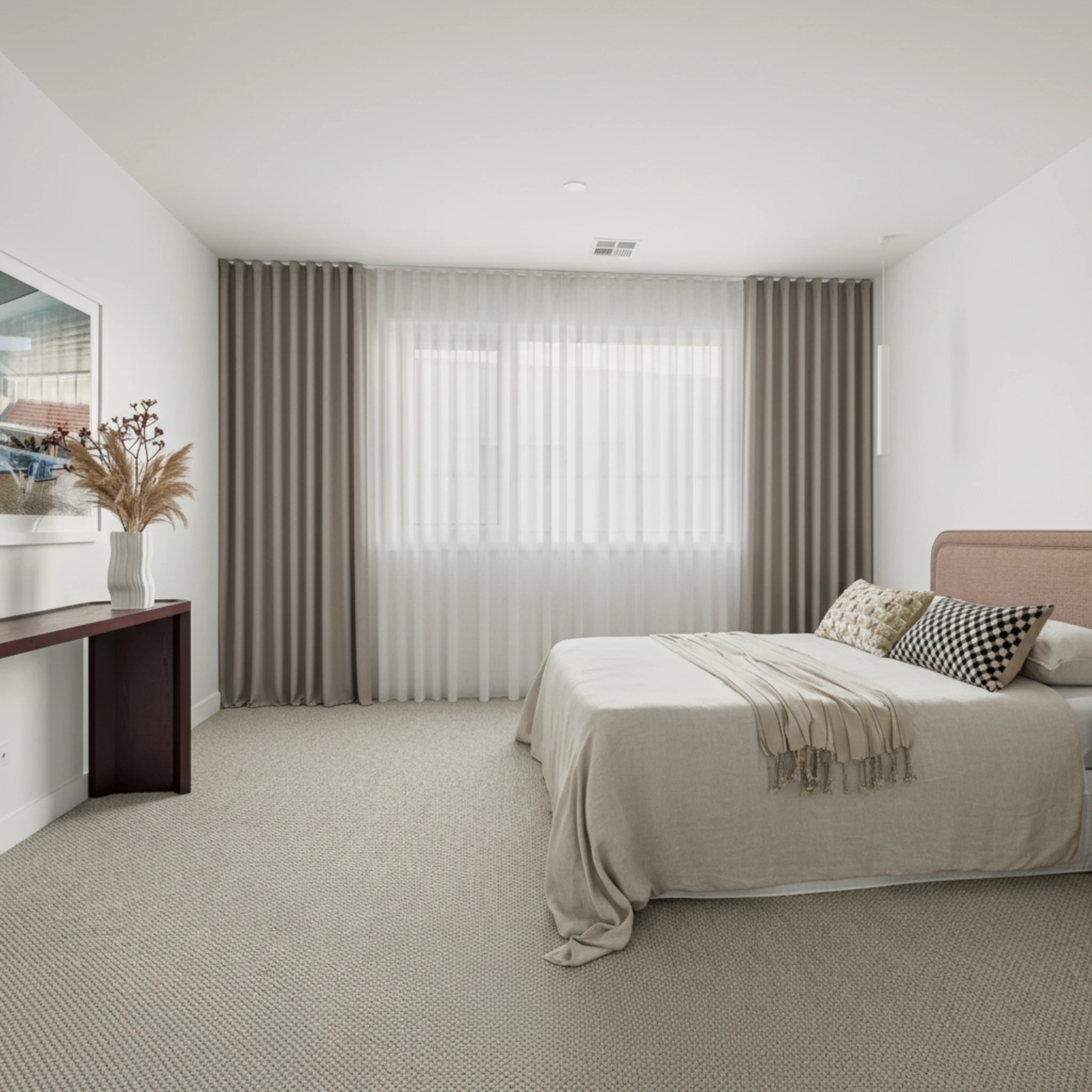 This is a double curtain system made with two layers installed on individual tracks. One layer features the Coast Off White sheer curtain, designed to gently filter daylight, soften the space and provide comfortable daytime privacy. The other layer is the Epic Putty blockout curtain, which delivers night-time privacy, darkness and added insulation. Together, the two layers give you flexible light control and a beautifully layered finish that suits modern Australian homes.