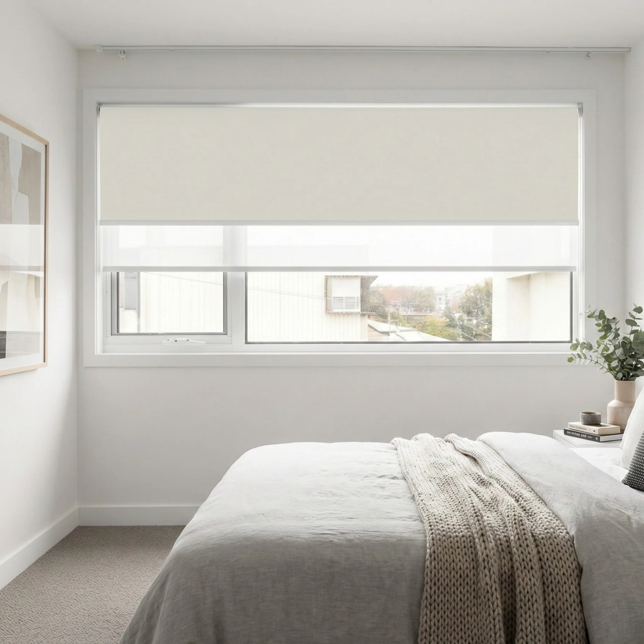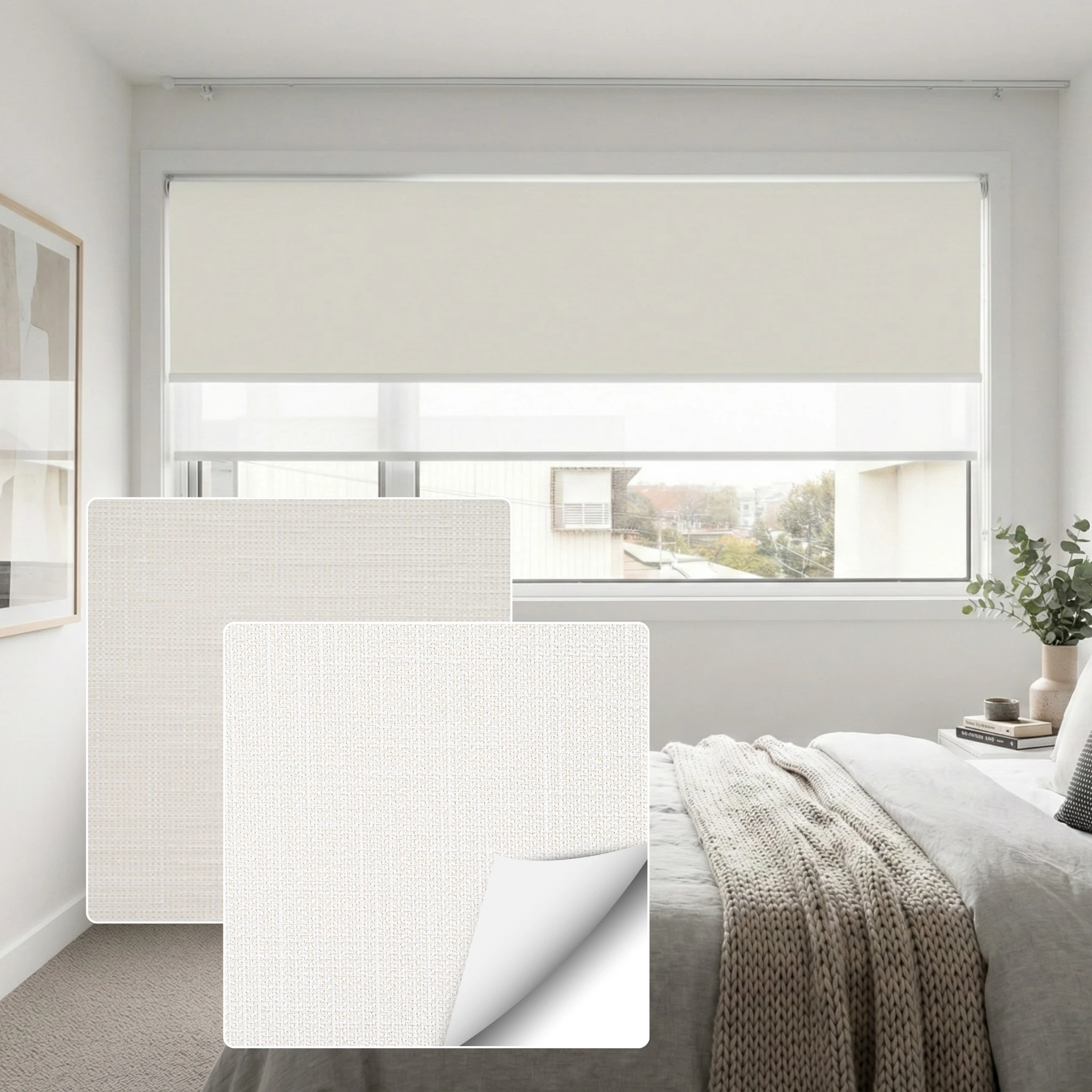 Linesque Almond Blockout + Whitsundays Blonde Sunscreen Double Roller Blind