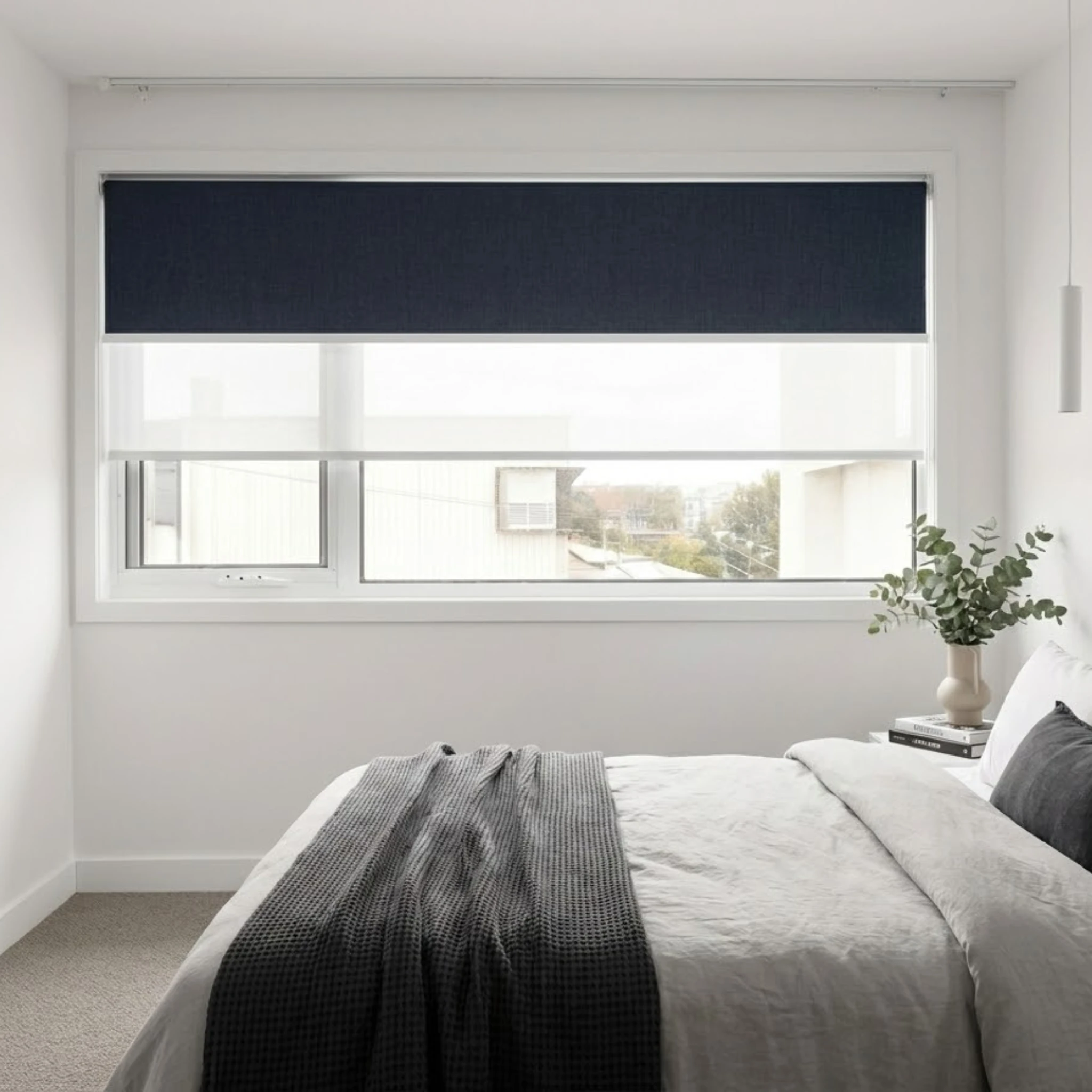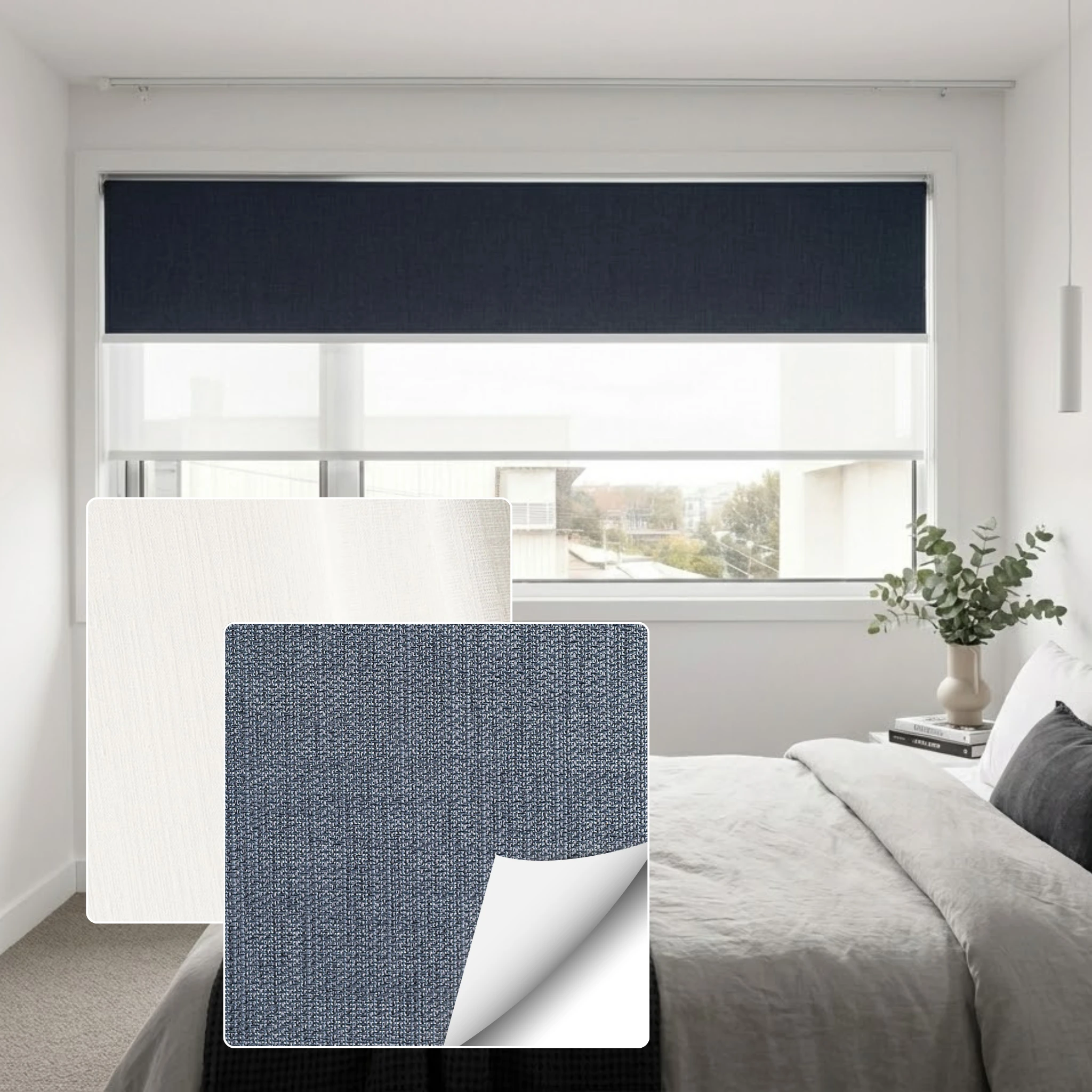 Linesque Denim Blockout + Whitsundays Whitewash Sunscreen Double Roller Blind