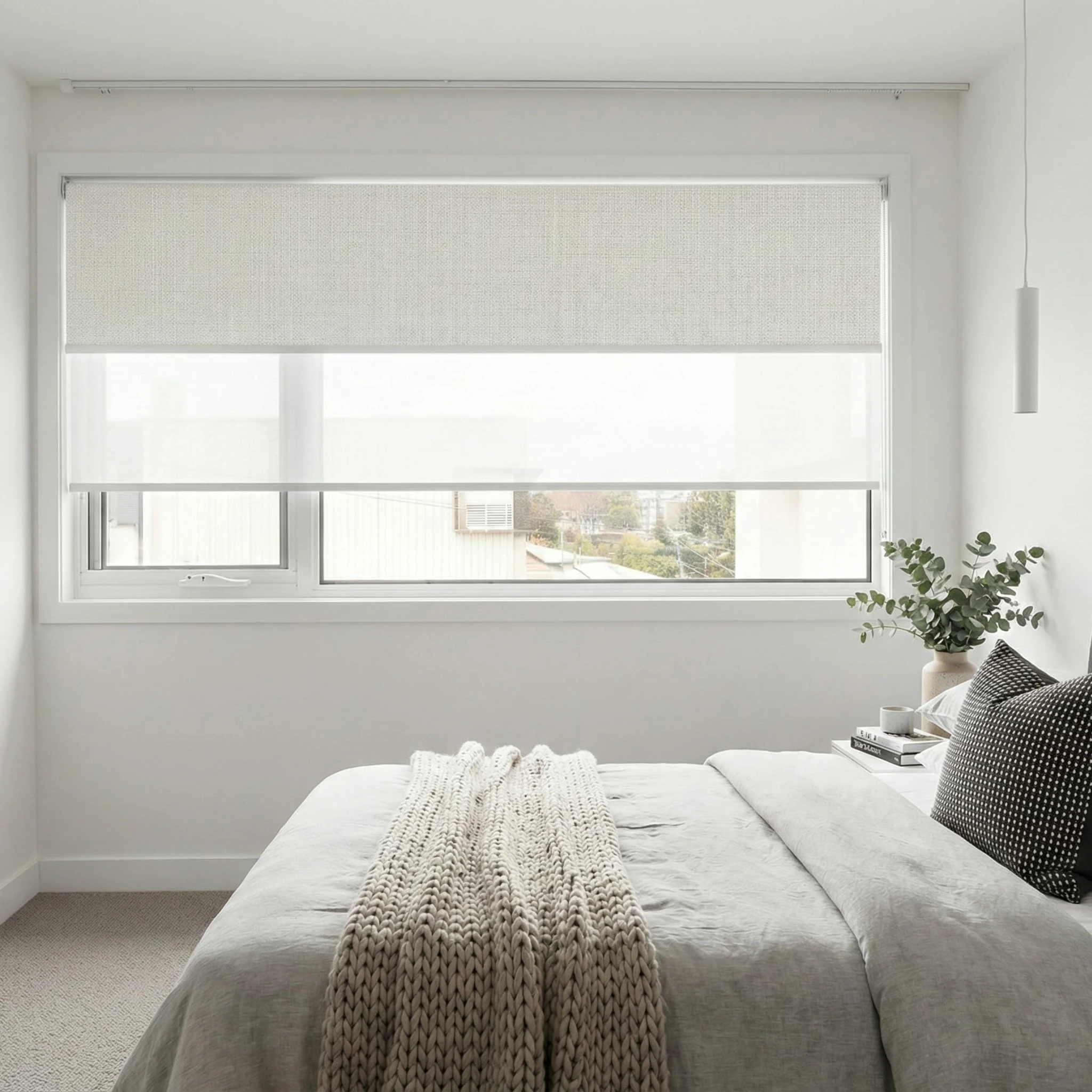 Linesque Dove Blockout + Whitsundays Morning Sunscreen Double Roller Blind