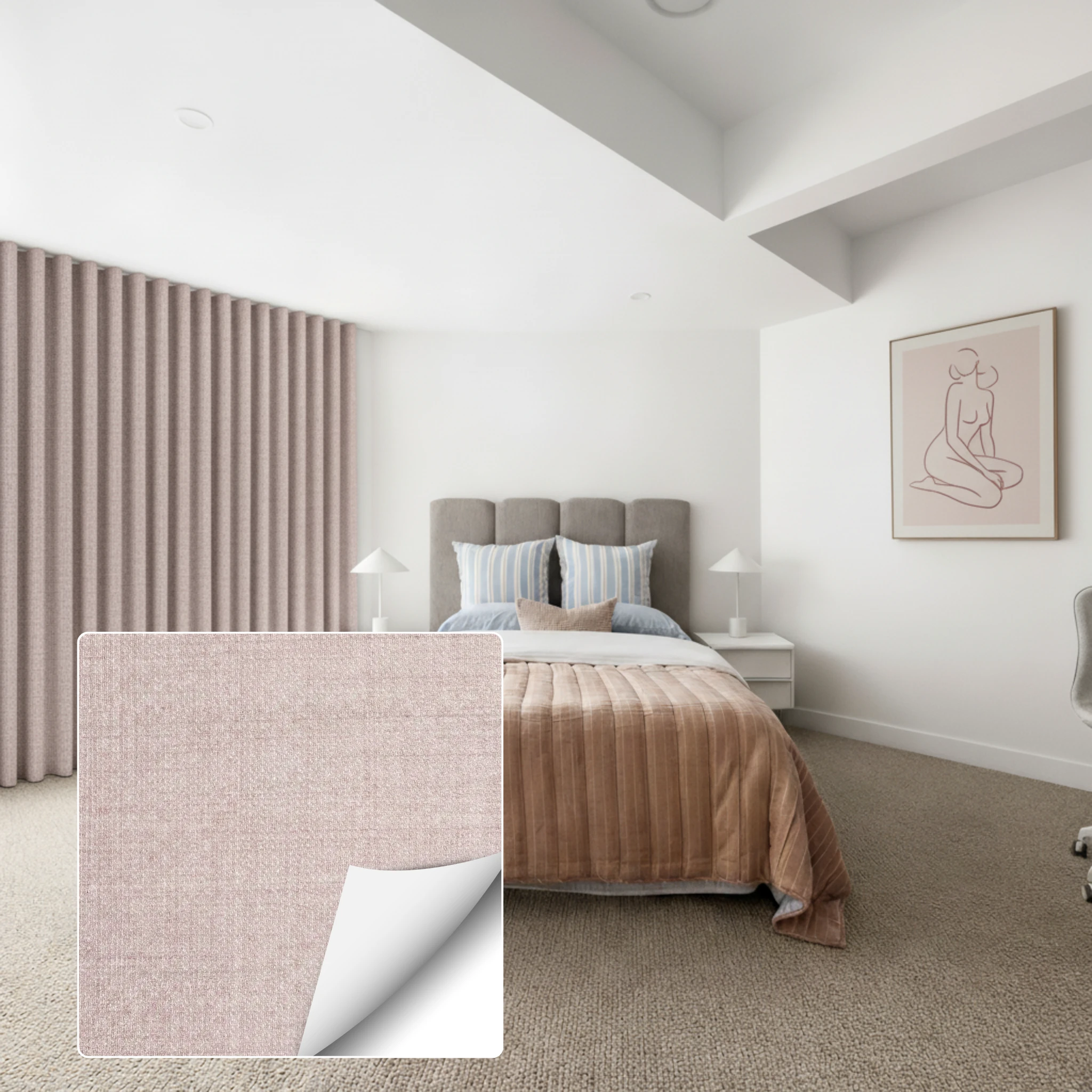 To keep your Soleil Blush Blockout Curtain looking its best, gently vacuum regularly to remove dust and debris. When spot cleaning is required, always test on a non-exposed area first and avoid excessive rubbing or abrasion to maintain the fabric’s finish and blockout performance.