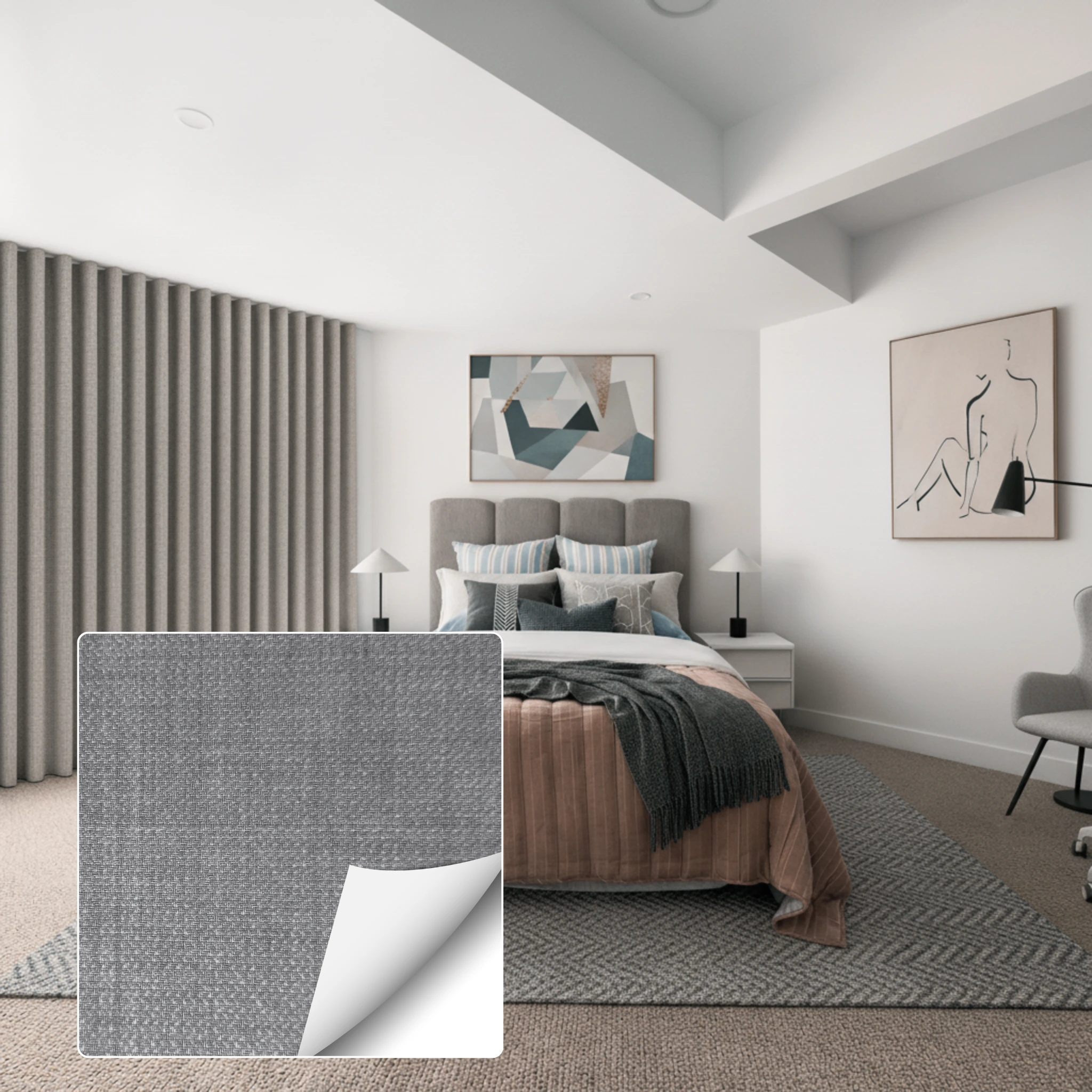 To keep your Soleil Cement Blockout Curtain looking its best, gently vacuum regularly to remove dust and debris. When spot cleaning is required, always test on a non-exposed area first and avoid excessive rubbing or abrasion to maintain the fabric’s finish and blockout performance.