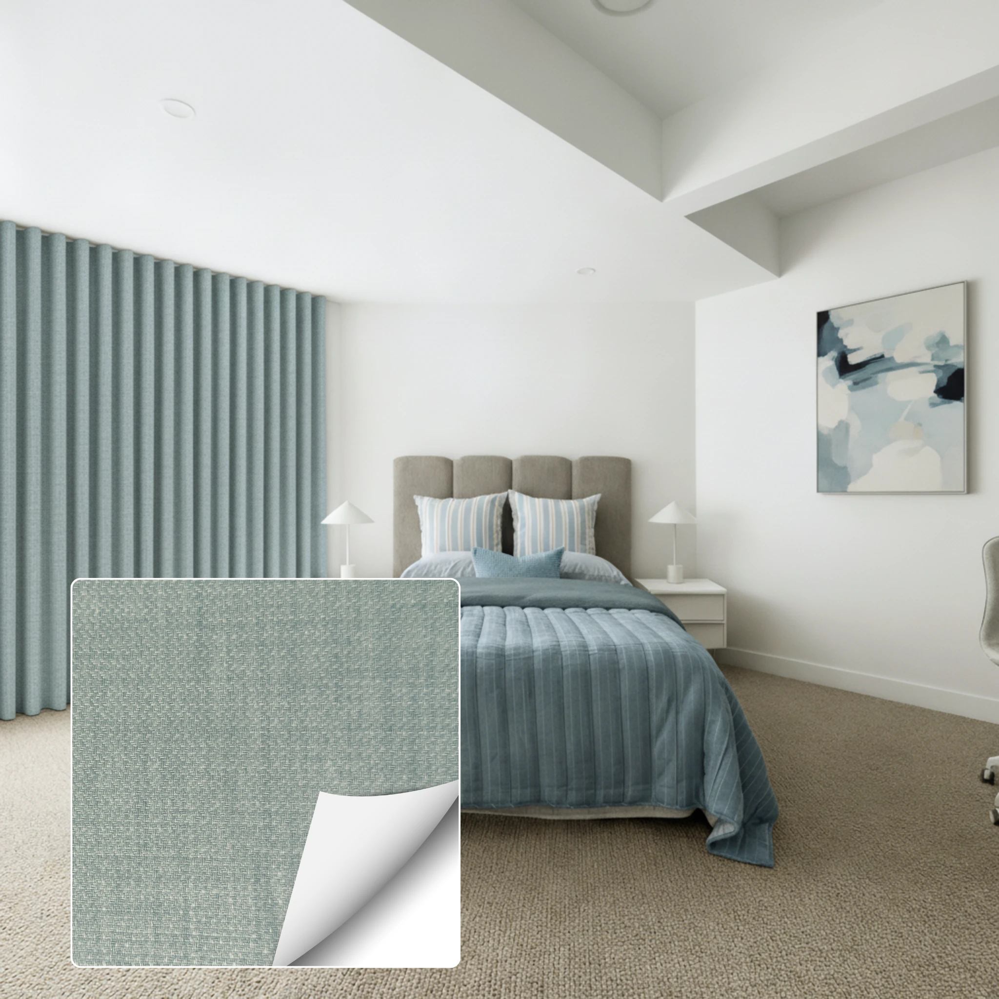 To keep your Soleil Spray Blockout Curtain looking its best, gently vacuum regularly to remove dust and debris. When spot cleaning is required, always test on a non-exposed area first and avoid excessive rubbing or abrasion to maintain the fabric’s finish and blockout performance.